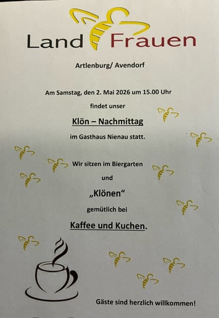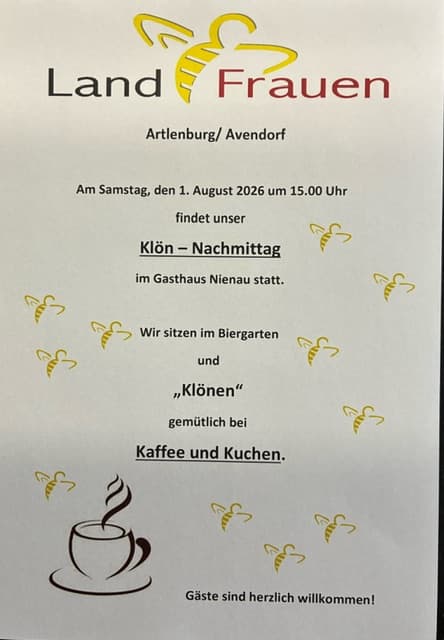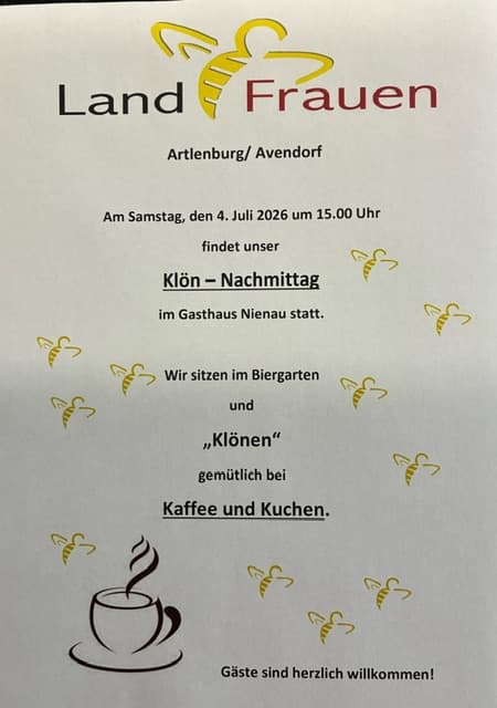 Artlenburg-Wir sitzen im Biergarten des Gasthauses Nienau und klönen bei Kaffee, Torte und anderen Getränken. Bei Regen sitzen wir im Wintergarten.