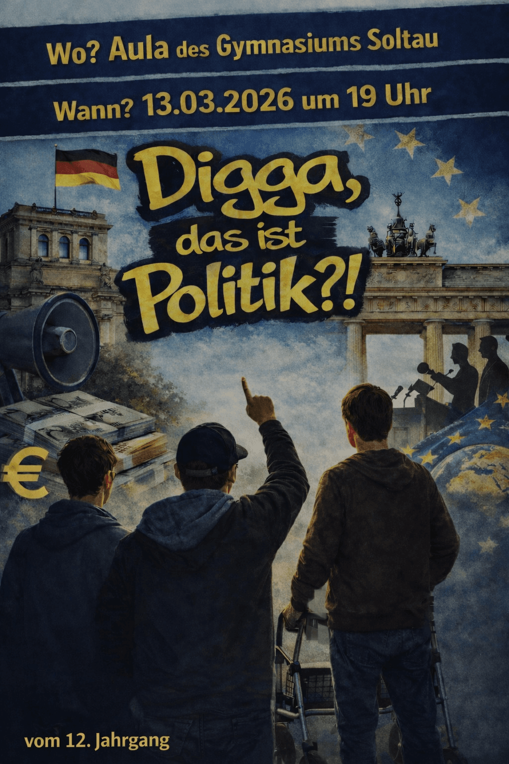 Soltau-Was hat Politik eigentlich mit unserem Alltag zu tun? Genau dieser Frage geht das Theaterstück „Digga, das ist Politik?!“ nach. Im Mittelpunkt stehen junge Menschen, die sich plötzlich mit Themen wie Mitbestimmung, Geld, Europa und öffentlicher Meinung konfrontiert sehen. Ohne erhobenen Zeigefinder…