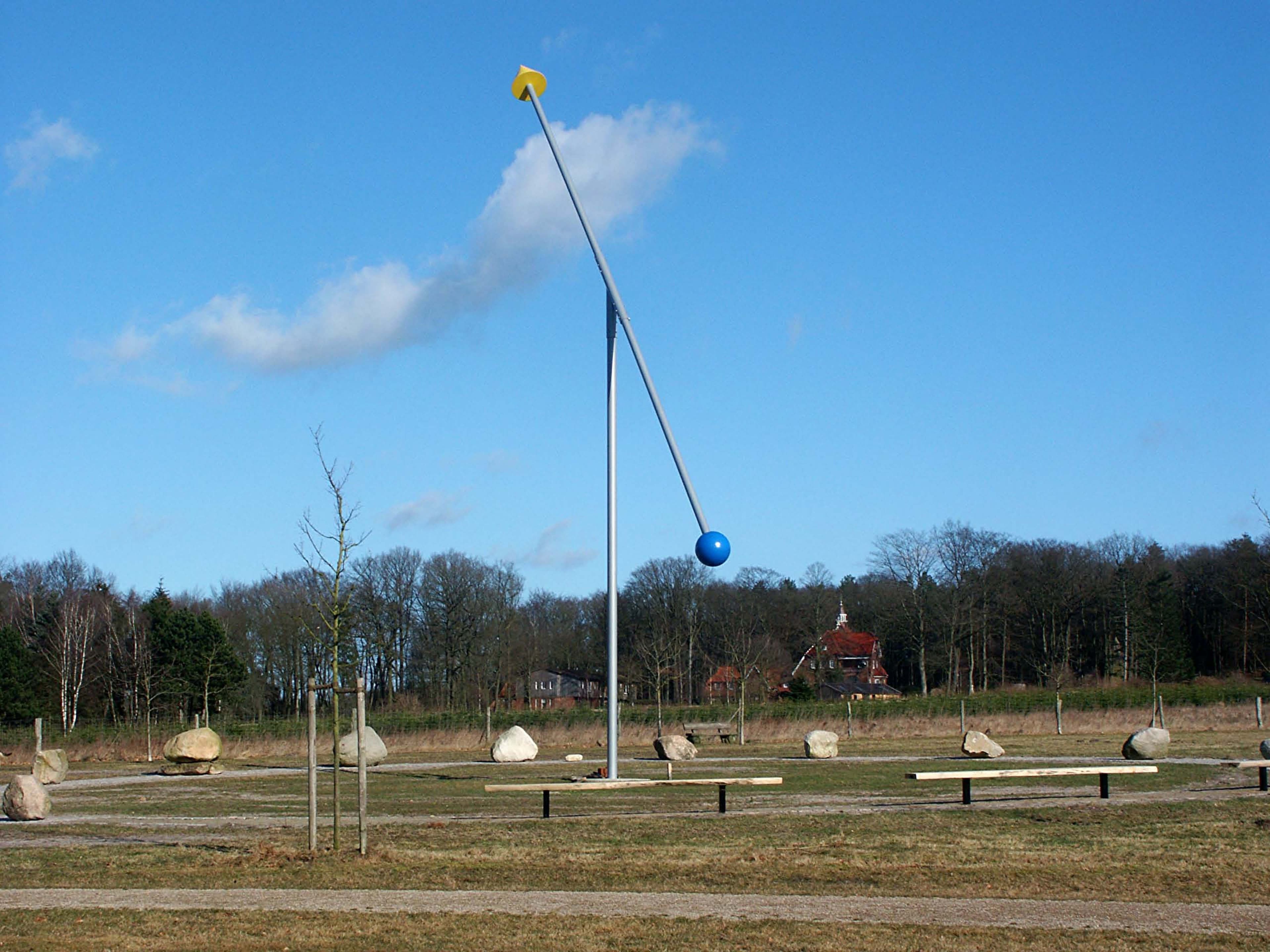 Das Ziffernblatt der Uhr wird dargestellt durch die Findlinge. Der Uhrzeiger wird dargestellt durch den schrägen Metallstab. Dieser verläuft entsprechend unserem Breitengrad (53,07 Grad) parallel zur Erdachse (Nord-Süd-Pol).