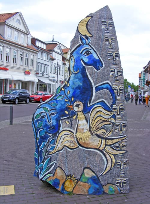 Eine besondere Kunstattraktion schmückt Uelzens Straßen: Durch den von Friedensreich Hundertwasser umgestalteten Bahnhof verfügt der Heideort bereits über einen der schönsten Bahnhöfe der Welt - jetzt führt der von der deutsch-schwedischen Künstlerin Dagmar Glemme gestaltete "Weg der Steine" vom Bahnhof in die Innenstadt.