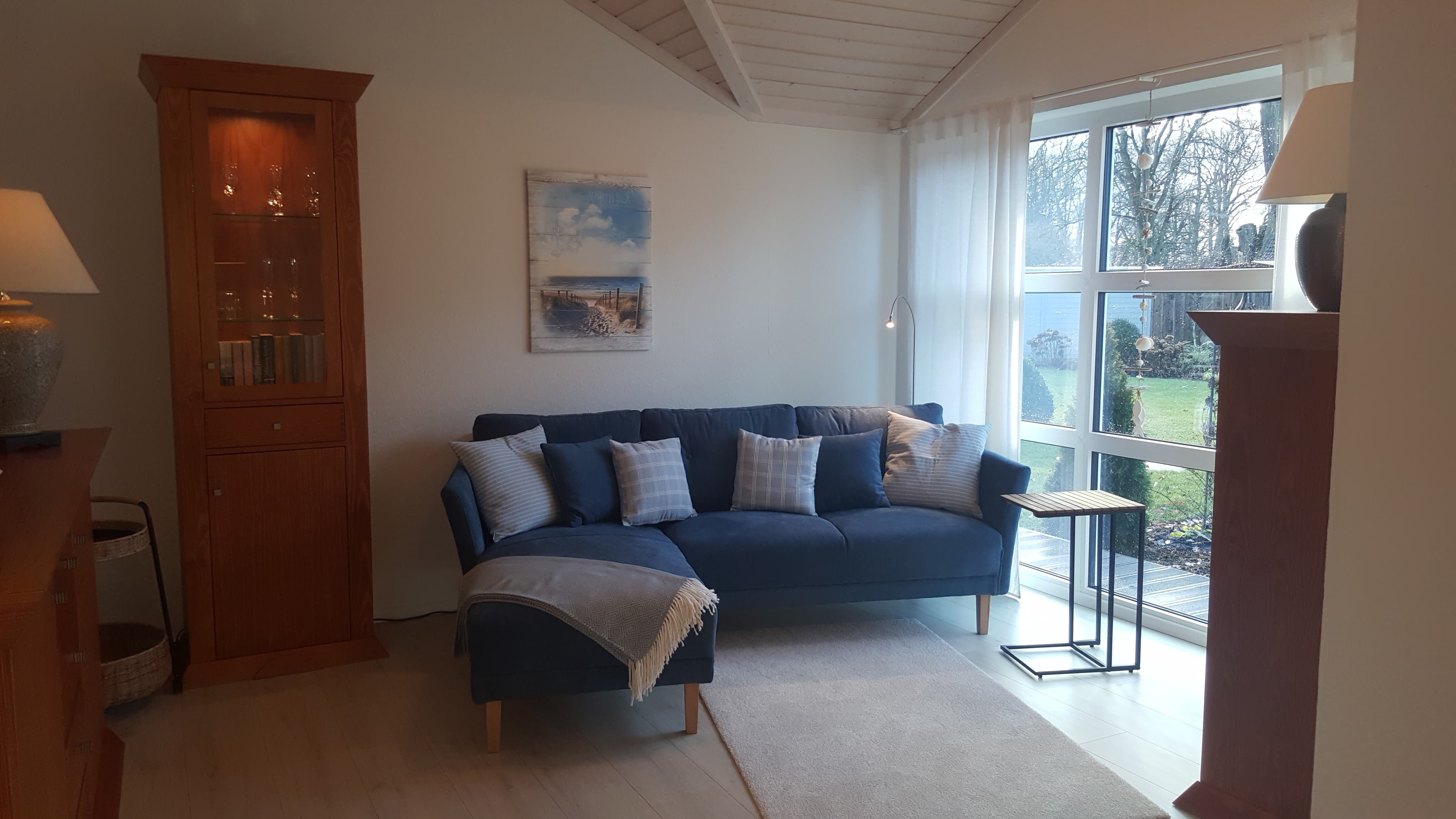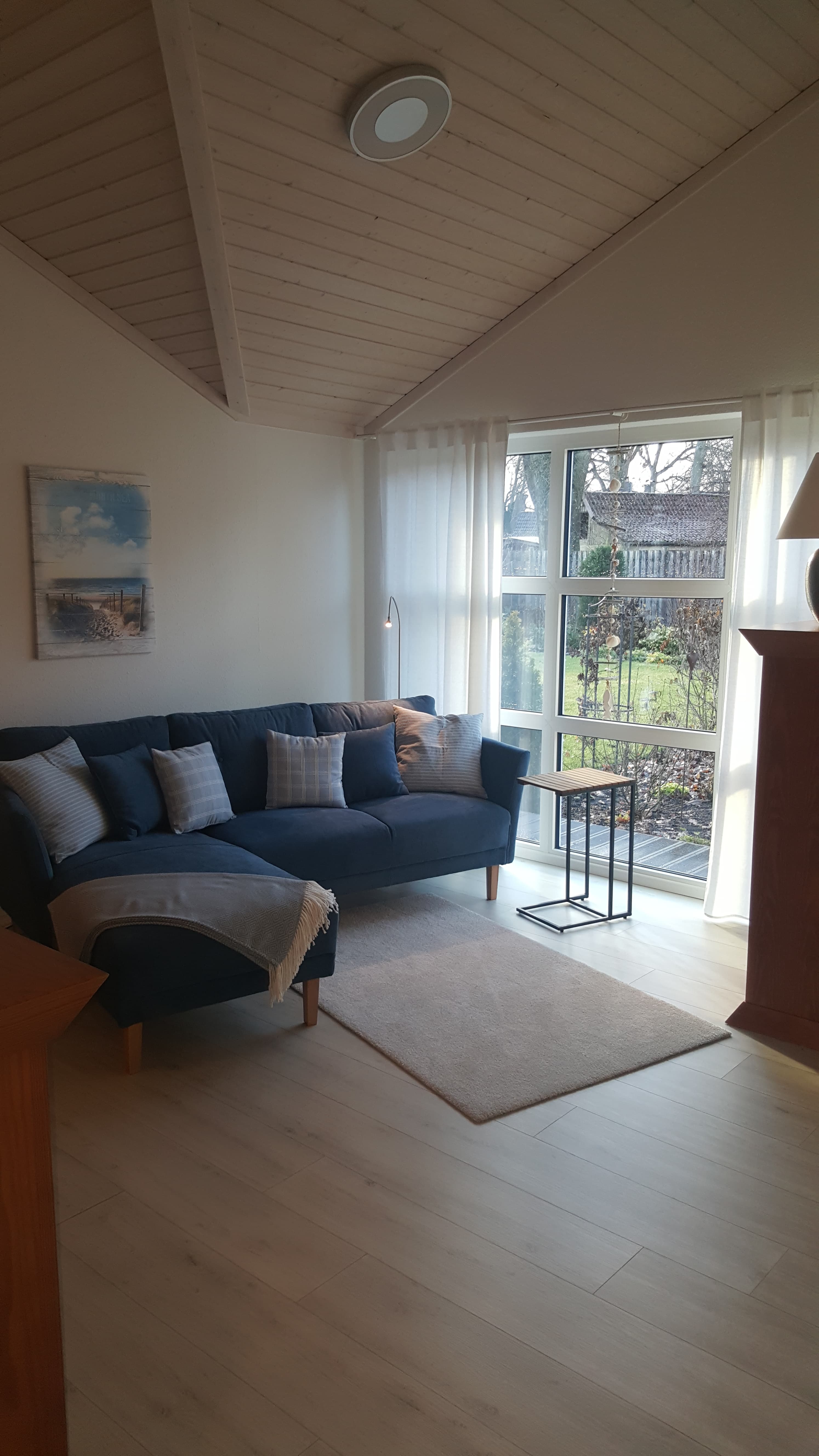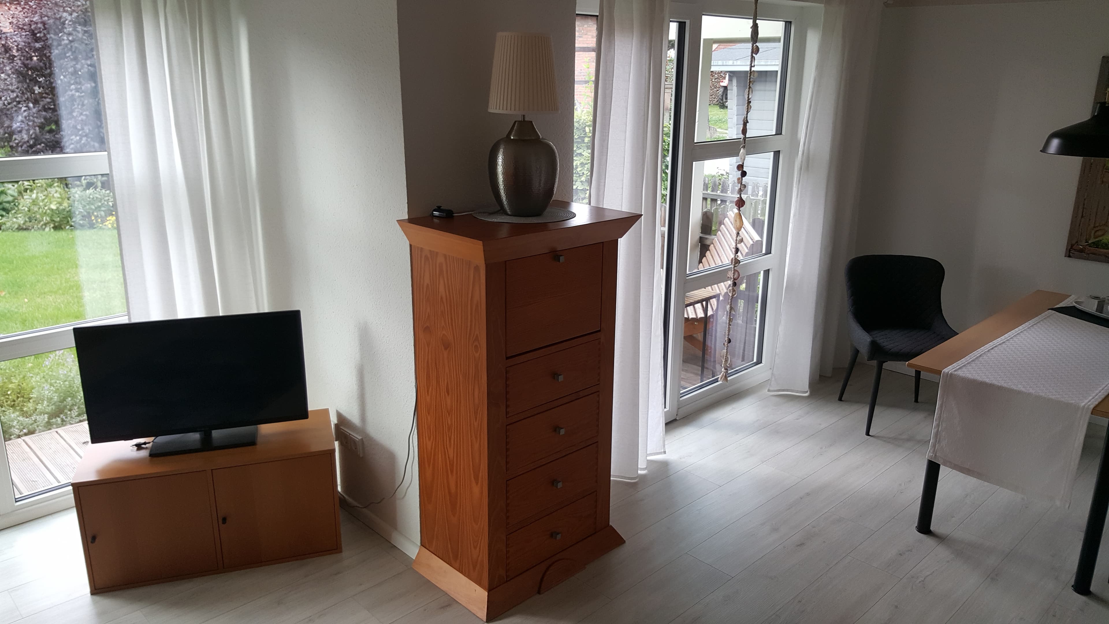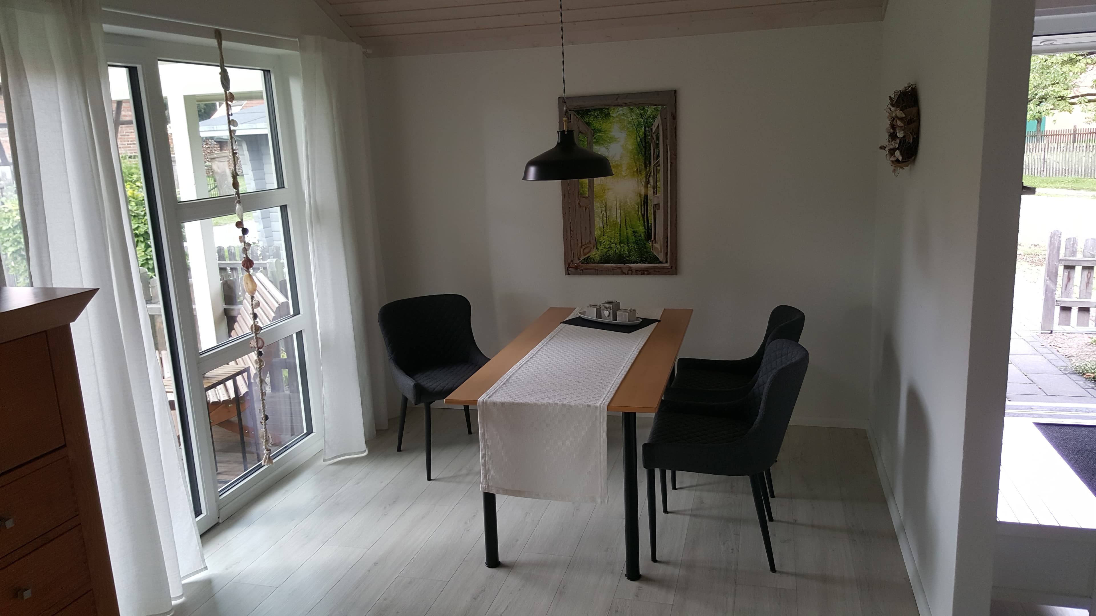 Das Haus hat einen offenen Wohnbereich , der sich über die Diele, den Wohn-Essbereich nebst Küche erstreckt. Zimmertüren haben das Schlafzimmer, das Bad mit Dusche und der HWR (mit Waschmaschine). TV und WLAN sind vorhanden.