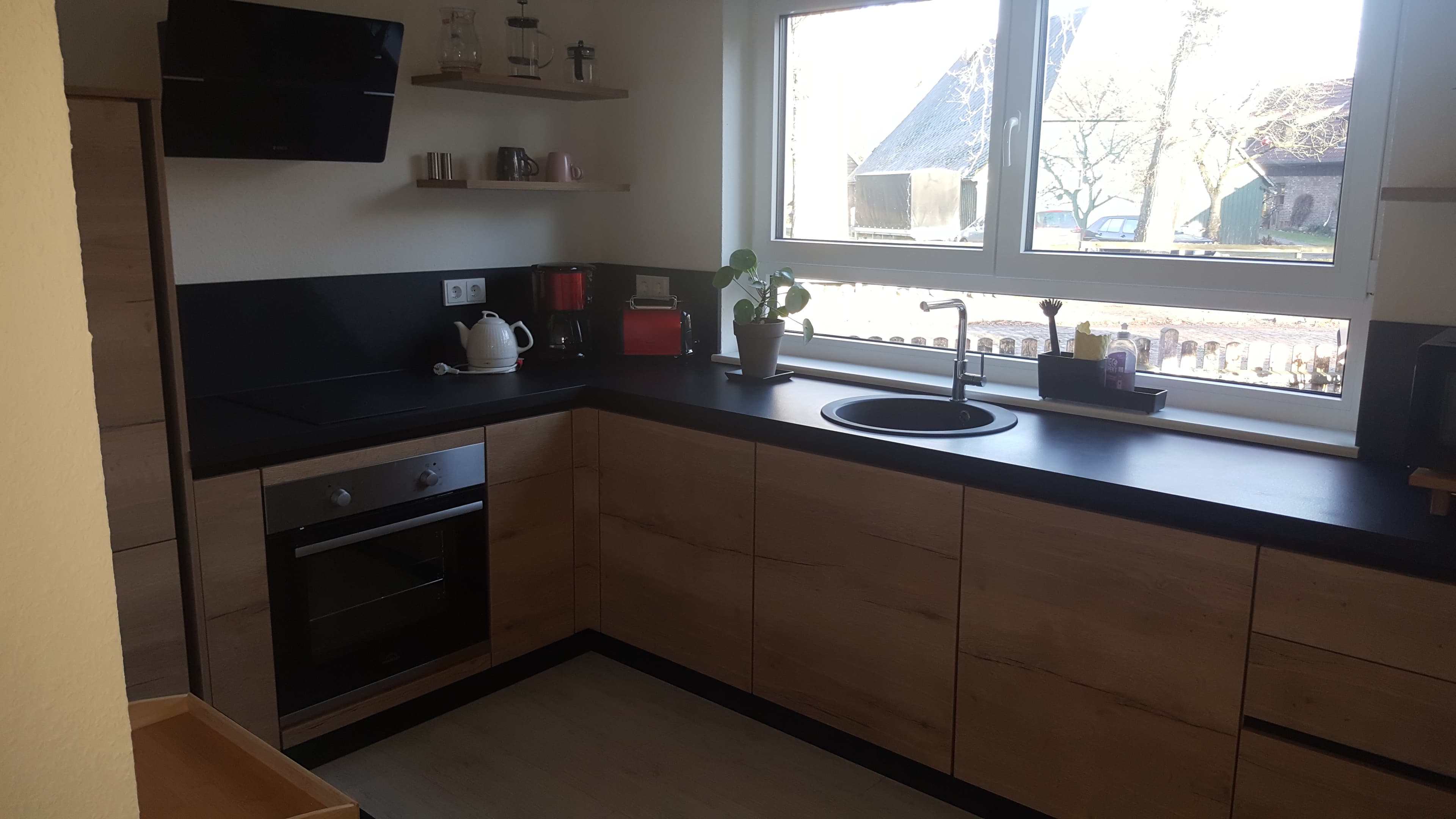 In der Küche gibt es neben Geschirr und Besteck einen Wasserkocher, Toaster, Kühlschrank mit Gefrierfach, Herd, eine Kaffeemaschine und Mikrowelle.
