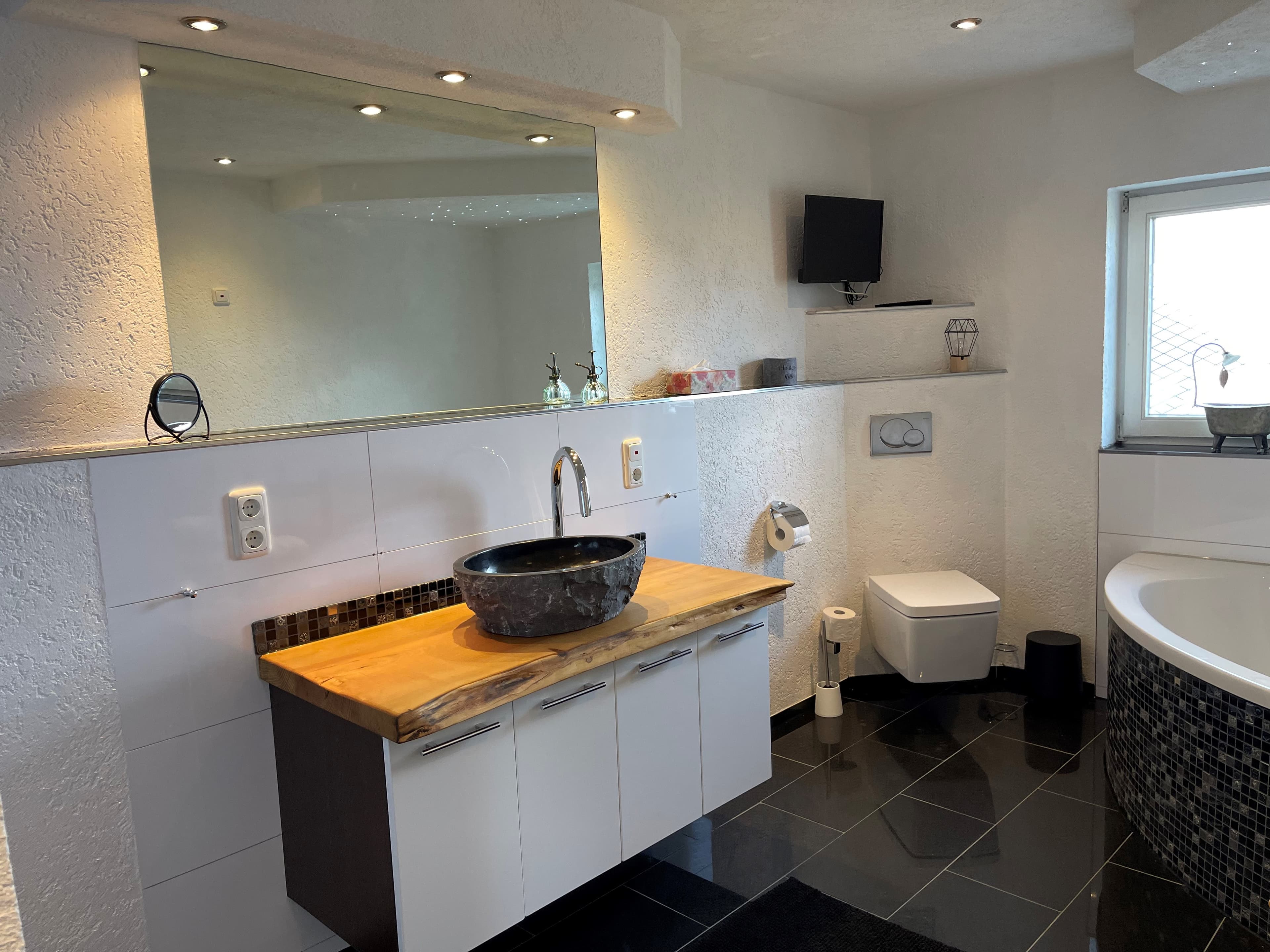 ein separates Schlafzimmer mit erhöhtem Boxspringbett und Ankleide, ein großes Badezimmer, eine separate Küche und ein großes Wohnzimmer mit 70 Zoll Smart-TV und Klimaanlage. Voll ausgestattete Küche, Badezimmer mit ebenerdiger 1,20m Regendusche Badewanne und TV.