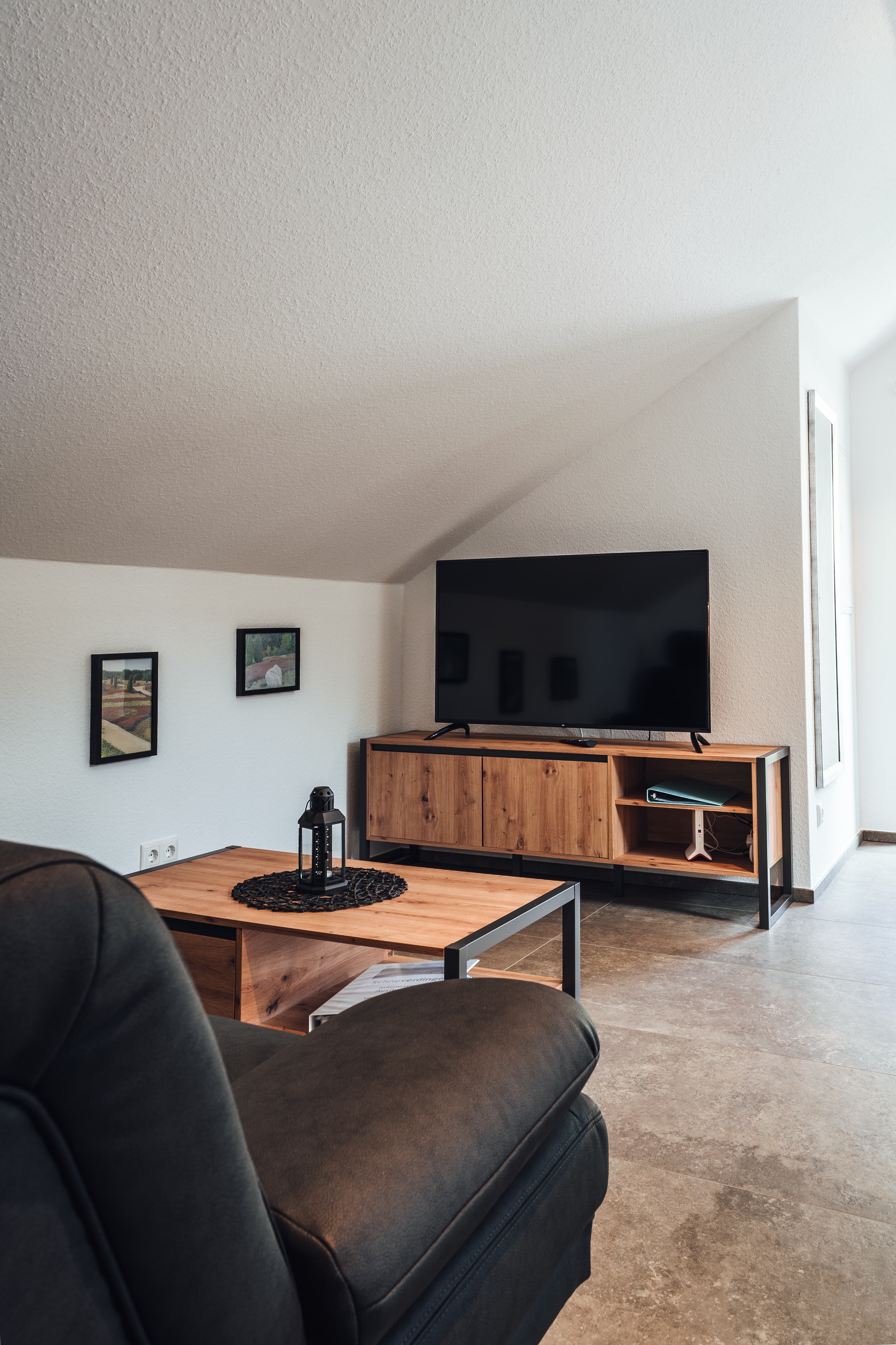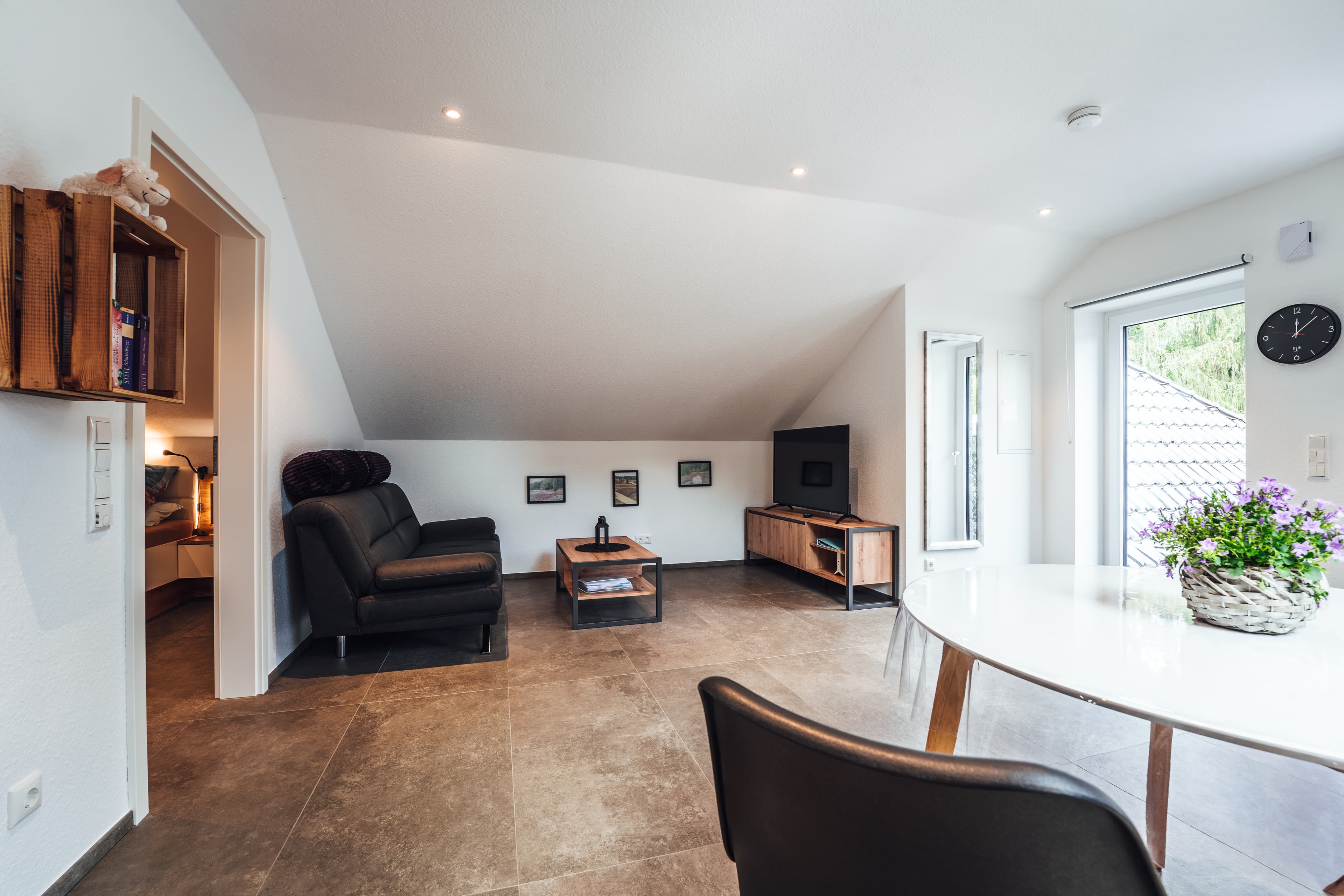 Die hell und geschmackvoll eingerichtete Ferienwohnung für zwei Personen, befindet sich im Obergeschoss des Ferienhauses. Sie verfügt über eine komplett eingerichtete Küchenzeile im Wohn-Essbereich, ein Schlafzimmer mit einem Doppelbett sowie ein Bad mit WC und Dusche. Genießen Sie die Ruhe und Sonne auf der möblierten Dachterrasse.