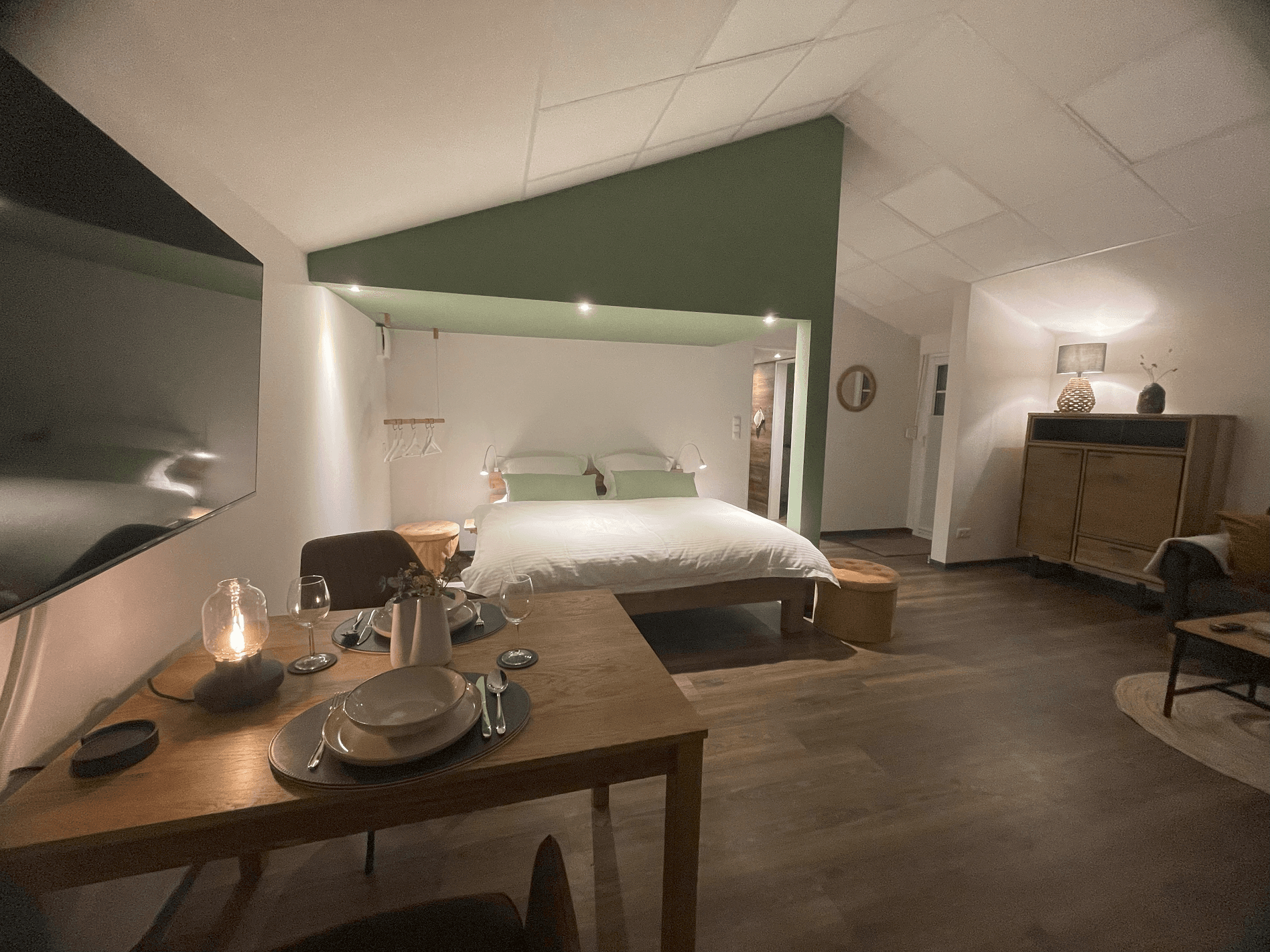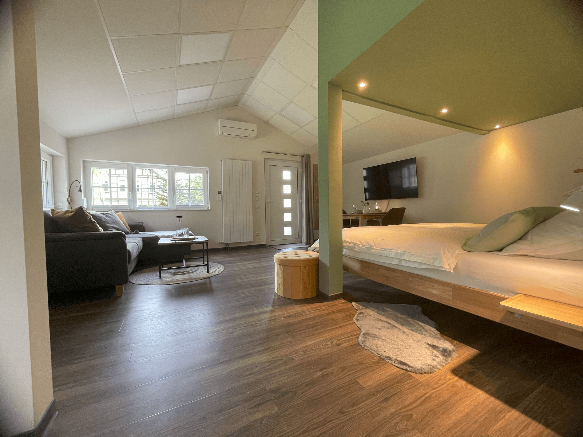 Im Inneren erwartet Sie ein heller, geschmackvoll eingerichteter Wohn-/Schlafraum mit Doppelbett (2 Matratzen 90 x 200 cm), der zum Wohlfühlen einlädt.