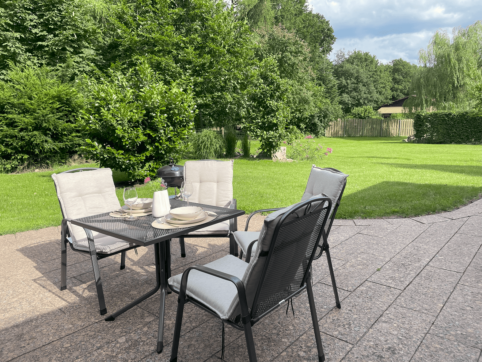 Das moderne Gartenhaus bietet Ihnen mit der großzügige Terrasse, umgeben von einer weitläufigen Grünfläche, viel Raum für entspannte Stunden im Freien..