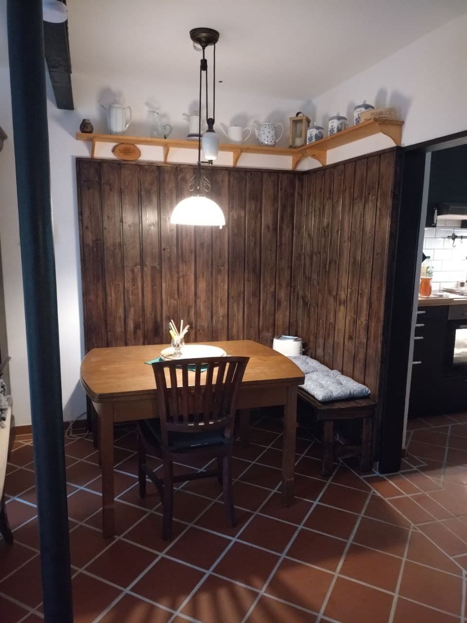 Die Ferienwohnung Rustikal ist ideal für Singles, Paare, oder kleine Familien , die eine ruhige Auszeit suchen. Hunde sind hier auch immer gern gesehen. Die Wohnung verfügt über ein großzügiges Wohn- und Esszimmer mit liebevoll ausgewählten Möbeln, die den rustikalen Stil unterstreichen. Der Kachelofen verleiht dem Raum eine gemütliche, heimelige Atmosphäre, in der man sich sofort wohlfühlt. Die moderne Küche ist voll ausgestattet und lässt keine Wünsche offen – von dem Handaufgebrühtem Kaffee bis hin zum Herd, hier können Sie Ihre Lieblingsgerichte zubereiten.