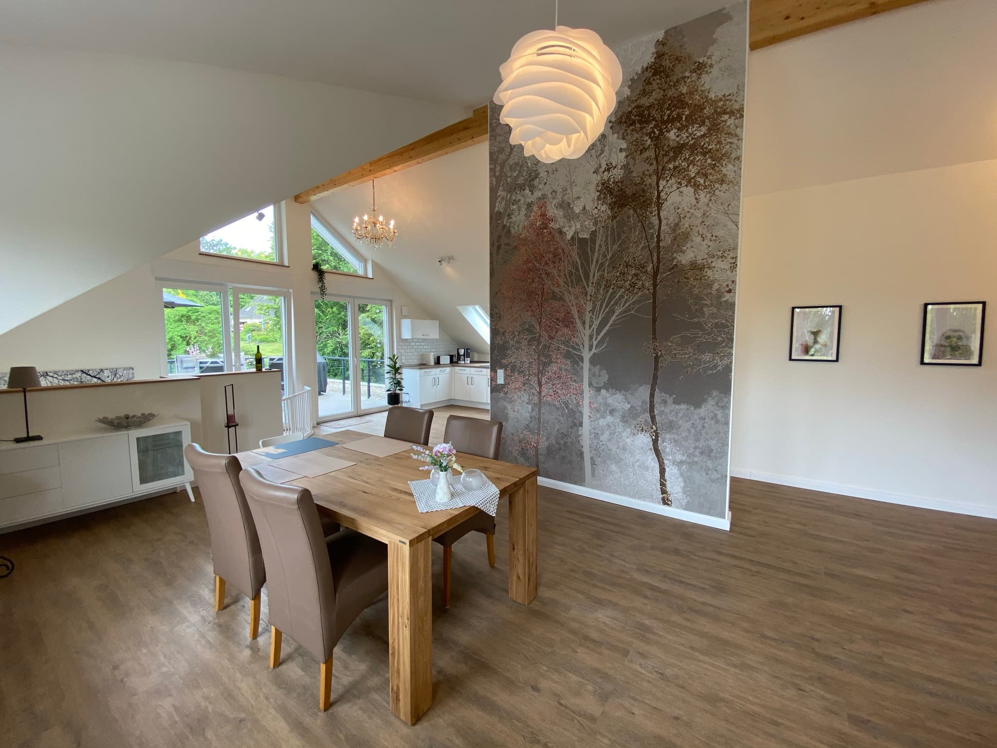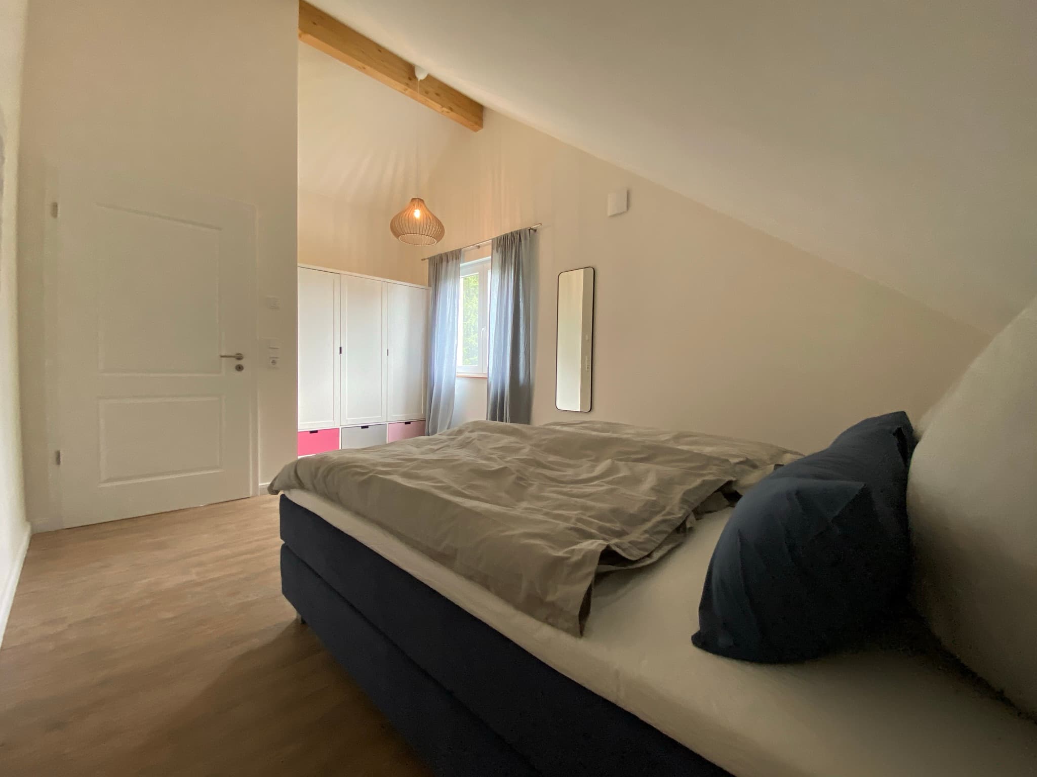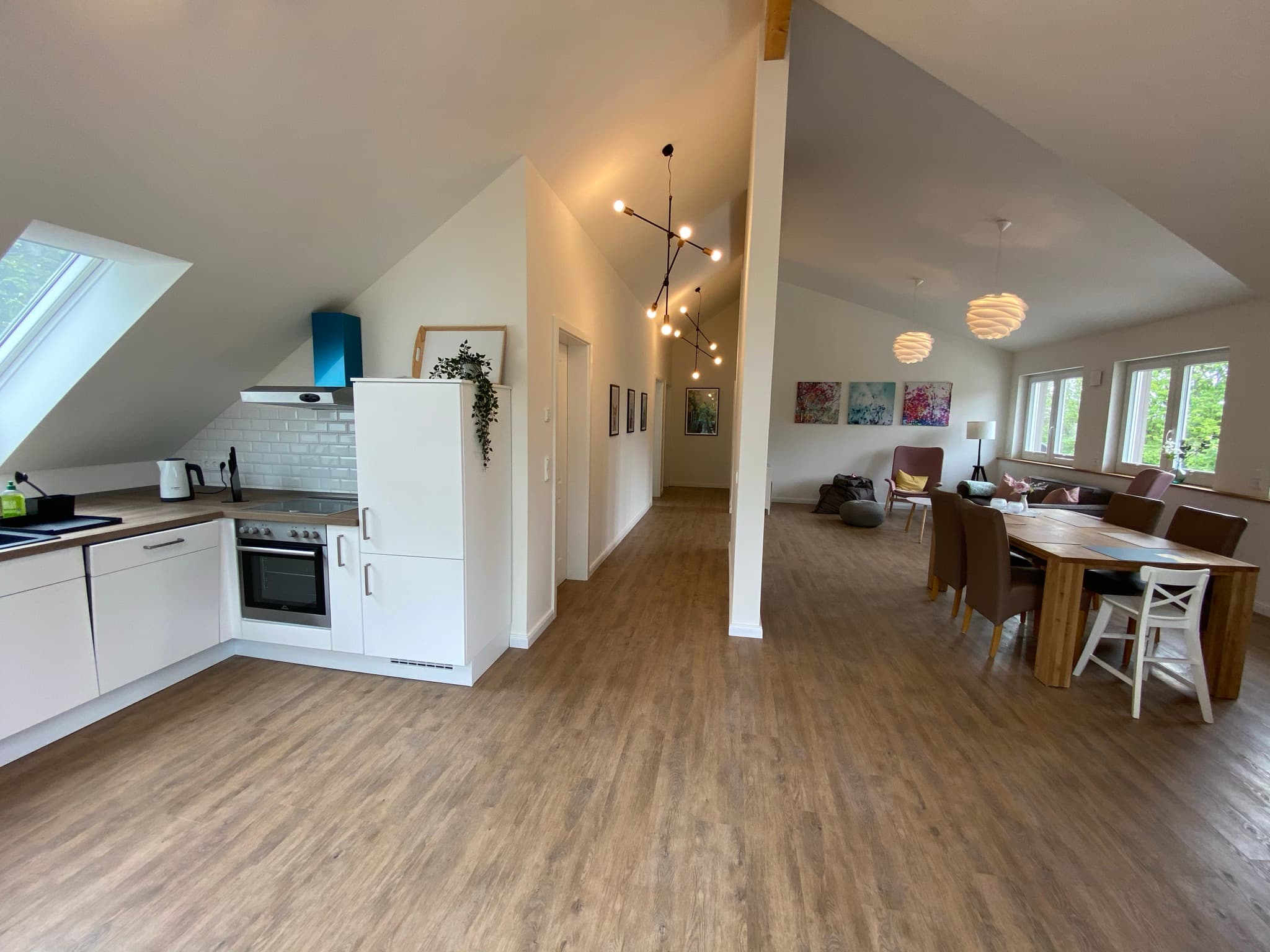 Die 2021 neu gebaute 5-Sterne* Ferienwohnung mit 102qm liegt im Obergeschoss. Der Wohn-, Ess- und Kochbereich ist mit seinen bis zu 4m hohen Decken sehr hell und großzügig. Die Wohnung bietet Ihnen 2 separate Schlafzimmer, mit einem großem Kingsize-Boxspringbett und 2 gemütlichen Einzelbetten. Auf der 21qm großen Süd-West-Dachterrasse mit umgebendem Gründach können Sie die Sonne beim Entspannen und Grillen genießen. Im eigenem Fahrradschuppen können Sie Ihre Fahrräder und e-Bikes sicher verschließen.