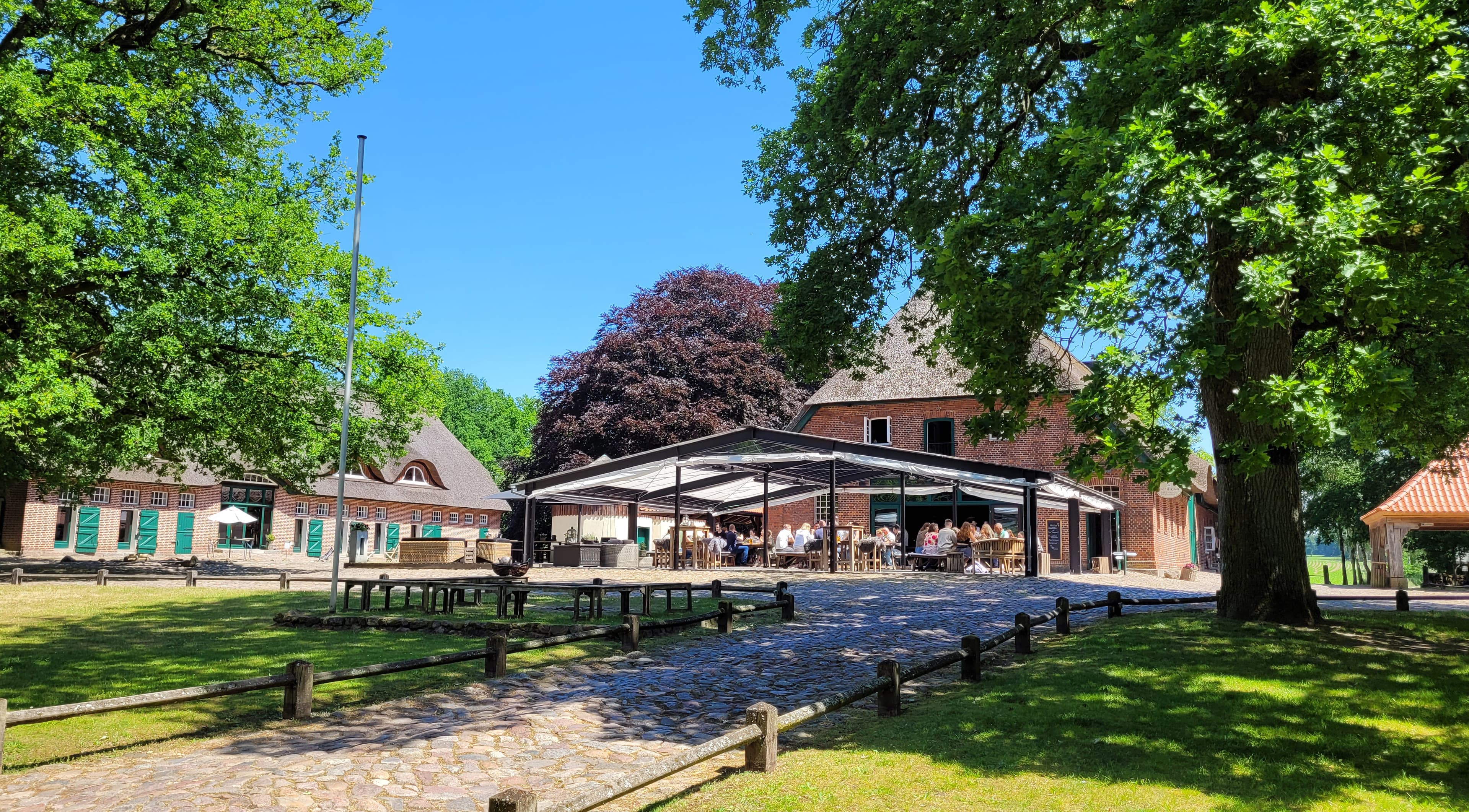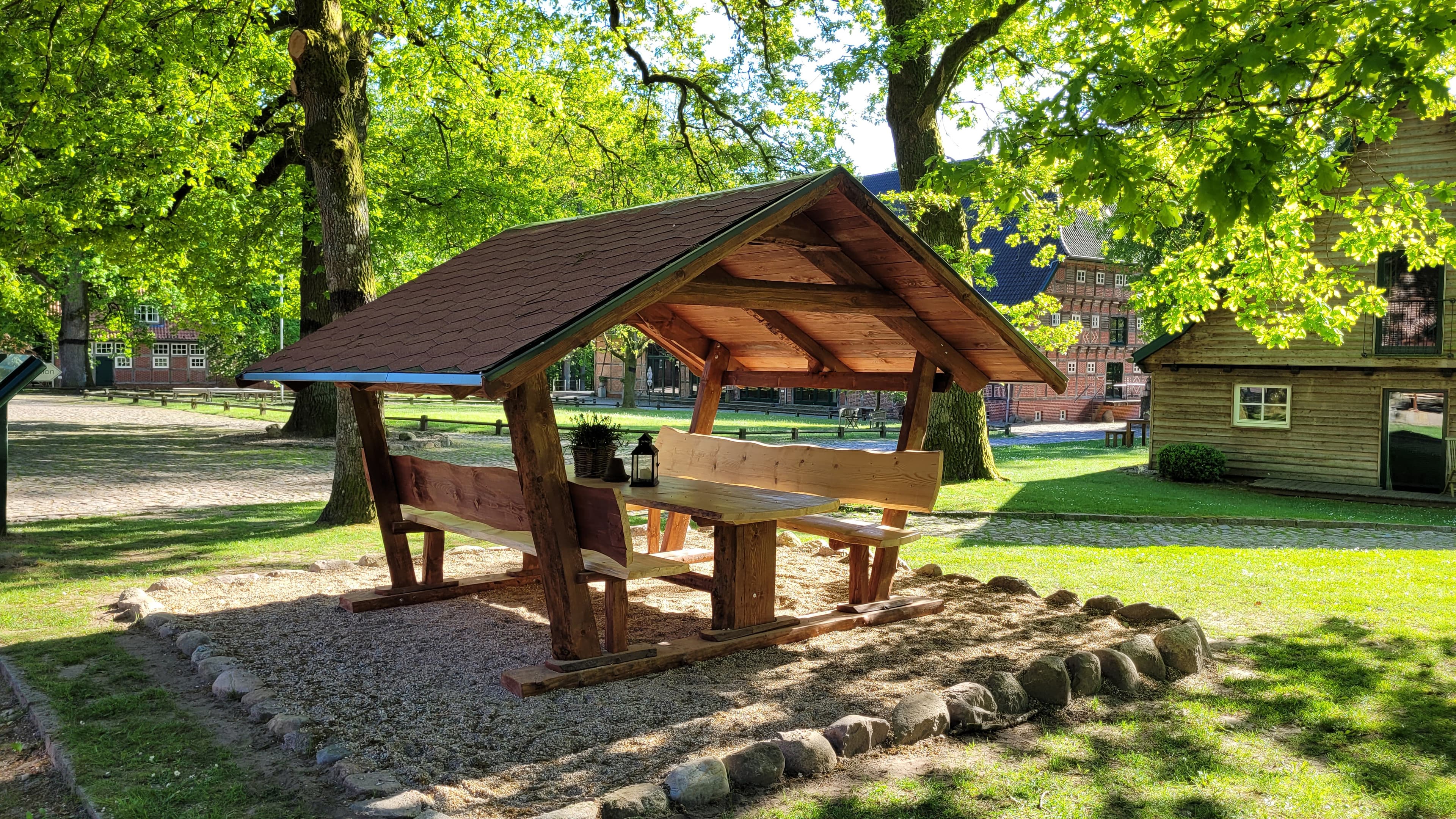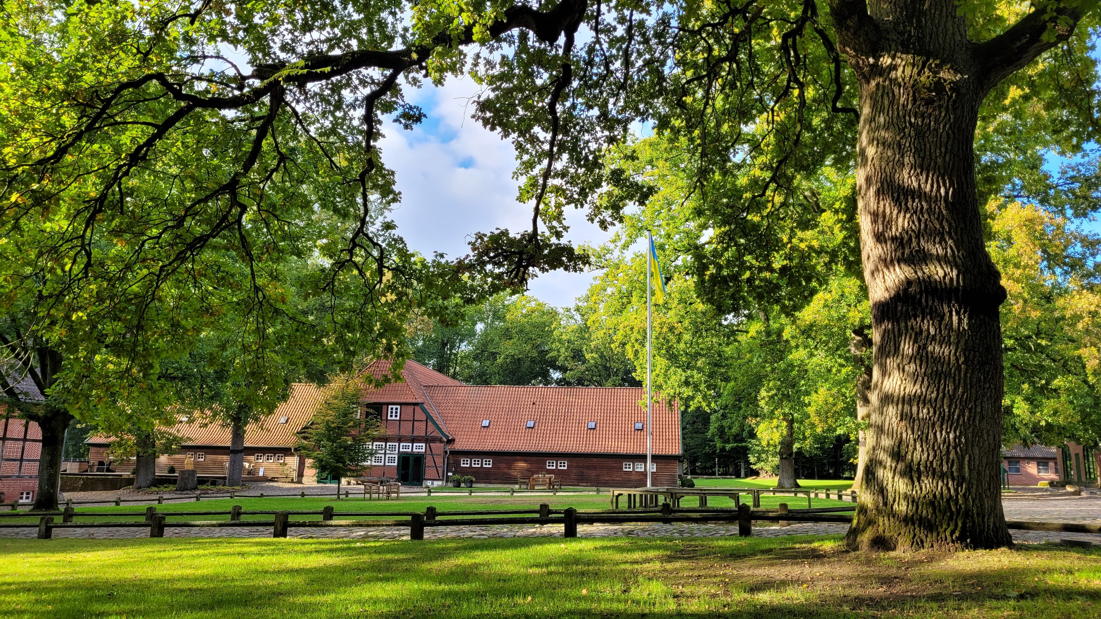 In absolut ruhiger Alleinlage gelegen begeistert Sie unser denkmalgeschützter Fachwerkhof inmitten alter Eichen mit wunderschöner Kulisse.