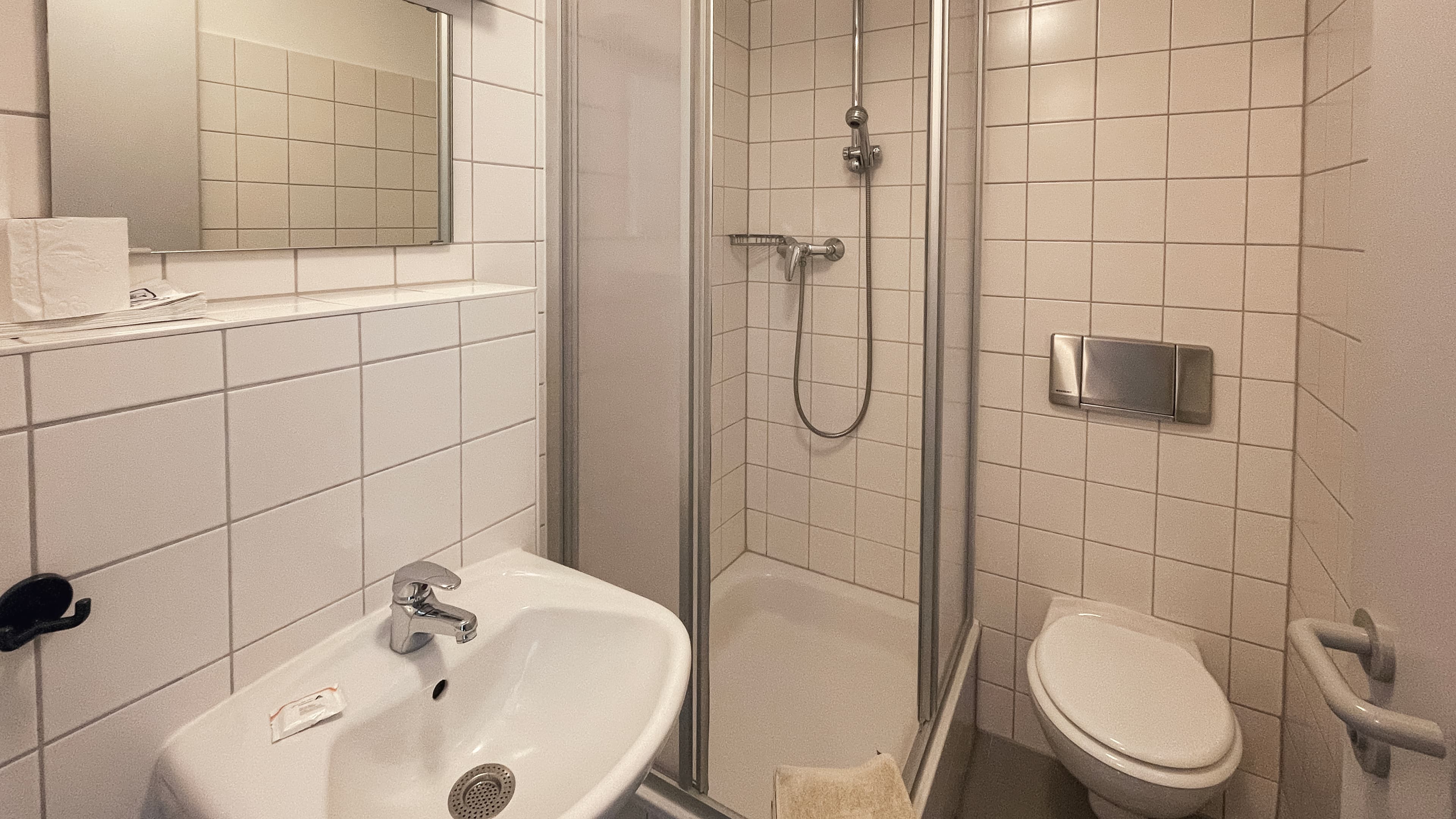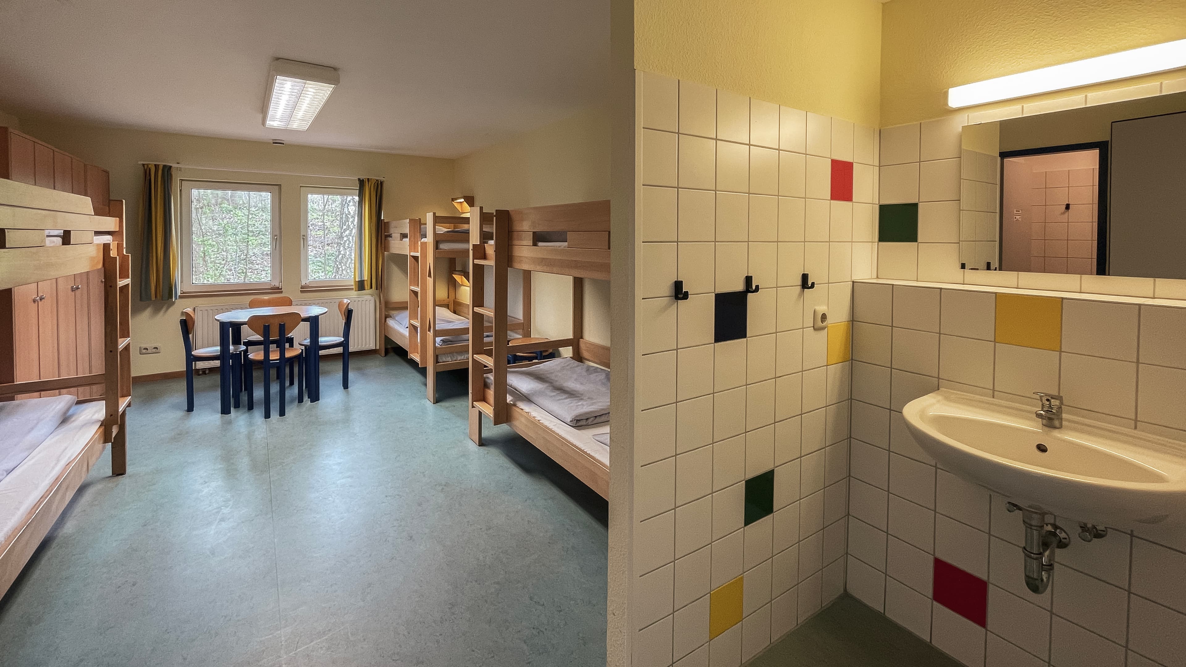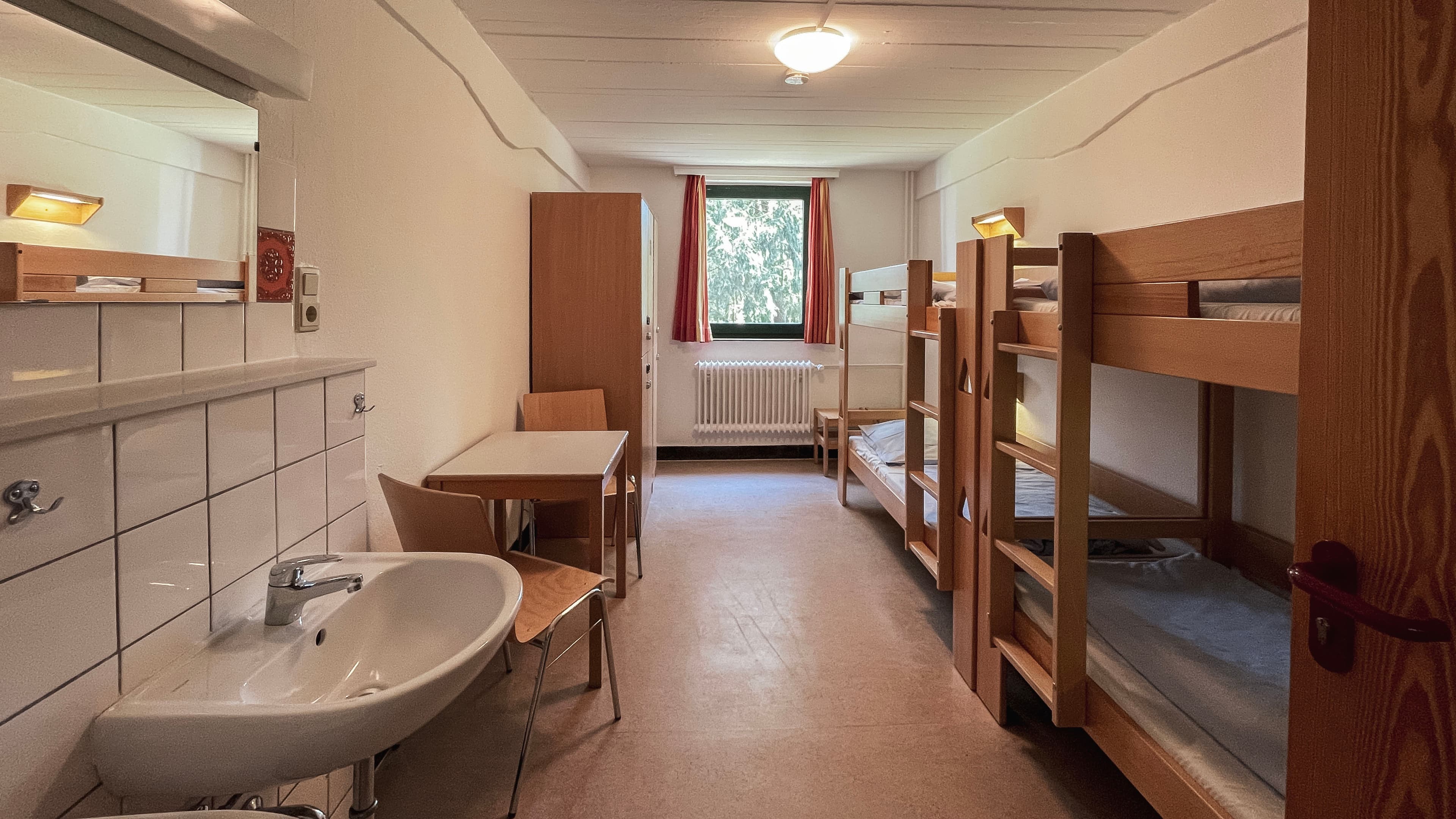 Jeder der bis zu 122 Gäste findet in den Ein-, Zwei- und Sechsbettzimmern im Haupt- und Nebenhaus ein Waschbecken vor. Im Haupthaus befinden sich die Dusch- und Toilettenräume in unmittelbarer Nähe. Im Nebenhaus haben alle Zimmer Dusche und WC. Nahezu alle Betreuerzimmer sind mit einem bzw. zwei Betten sowie Dusche und WC ausgestattet.