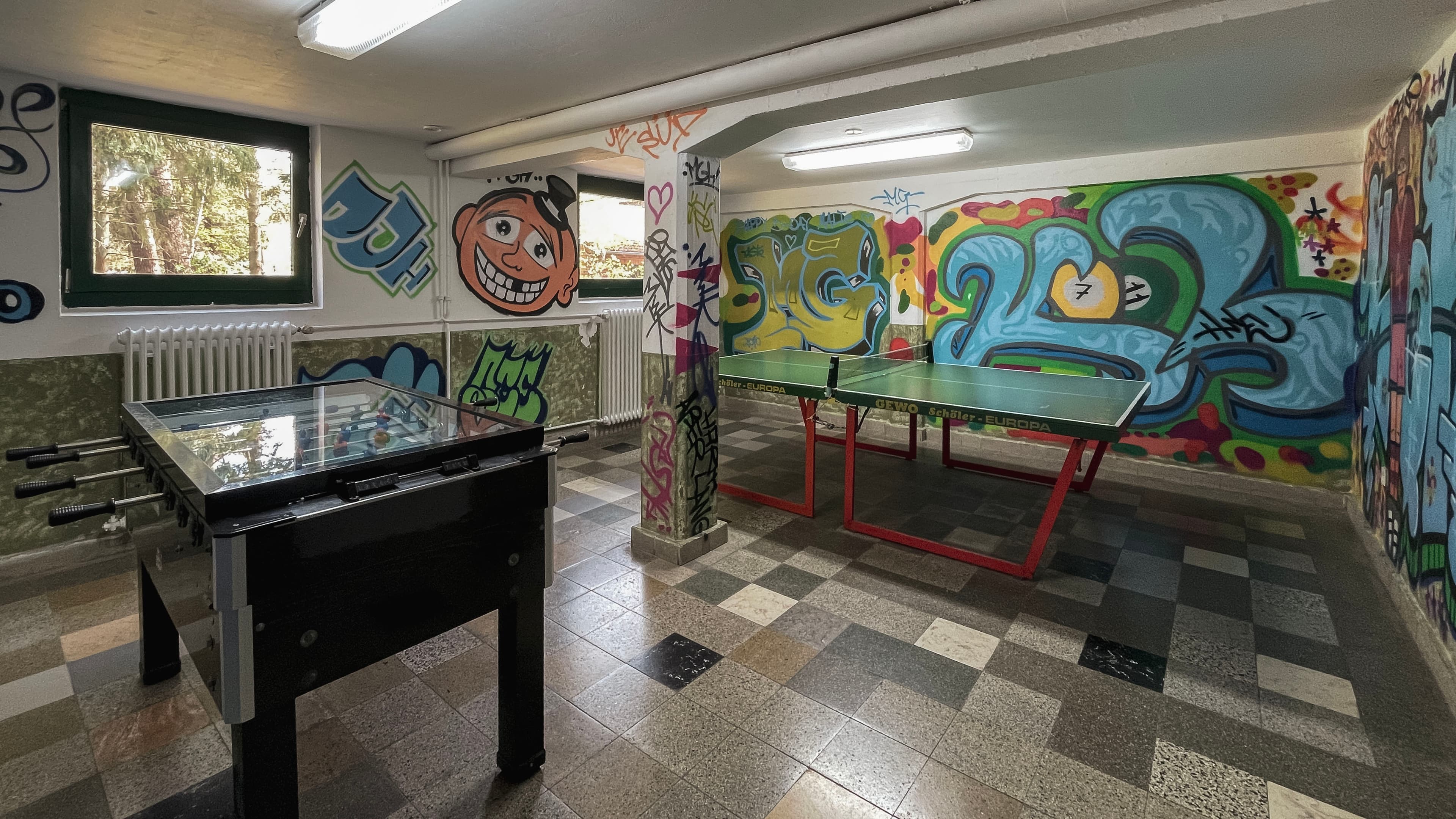Im Gebäude sorgen die kleinen Bälle von Tischtennis und Kicker für Spaß und Bewegung. Auf dem Außengelände warten Tischtennisplatte, Schaukel und Kletterwand auf euch. In unserem Spielzimmer gibt es auch an Schlechtwetter-Tagen Beschäftigung.