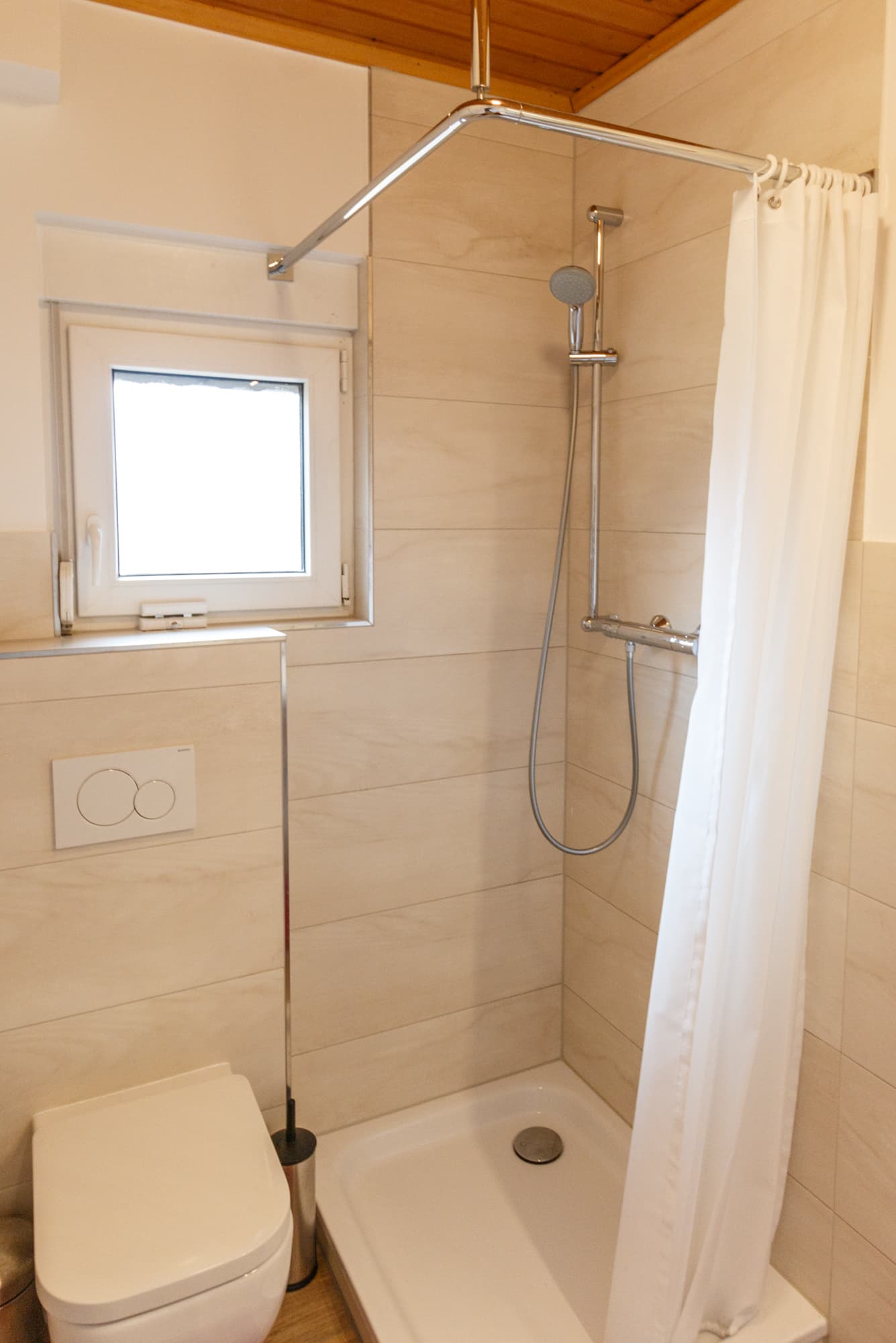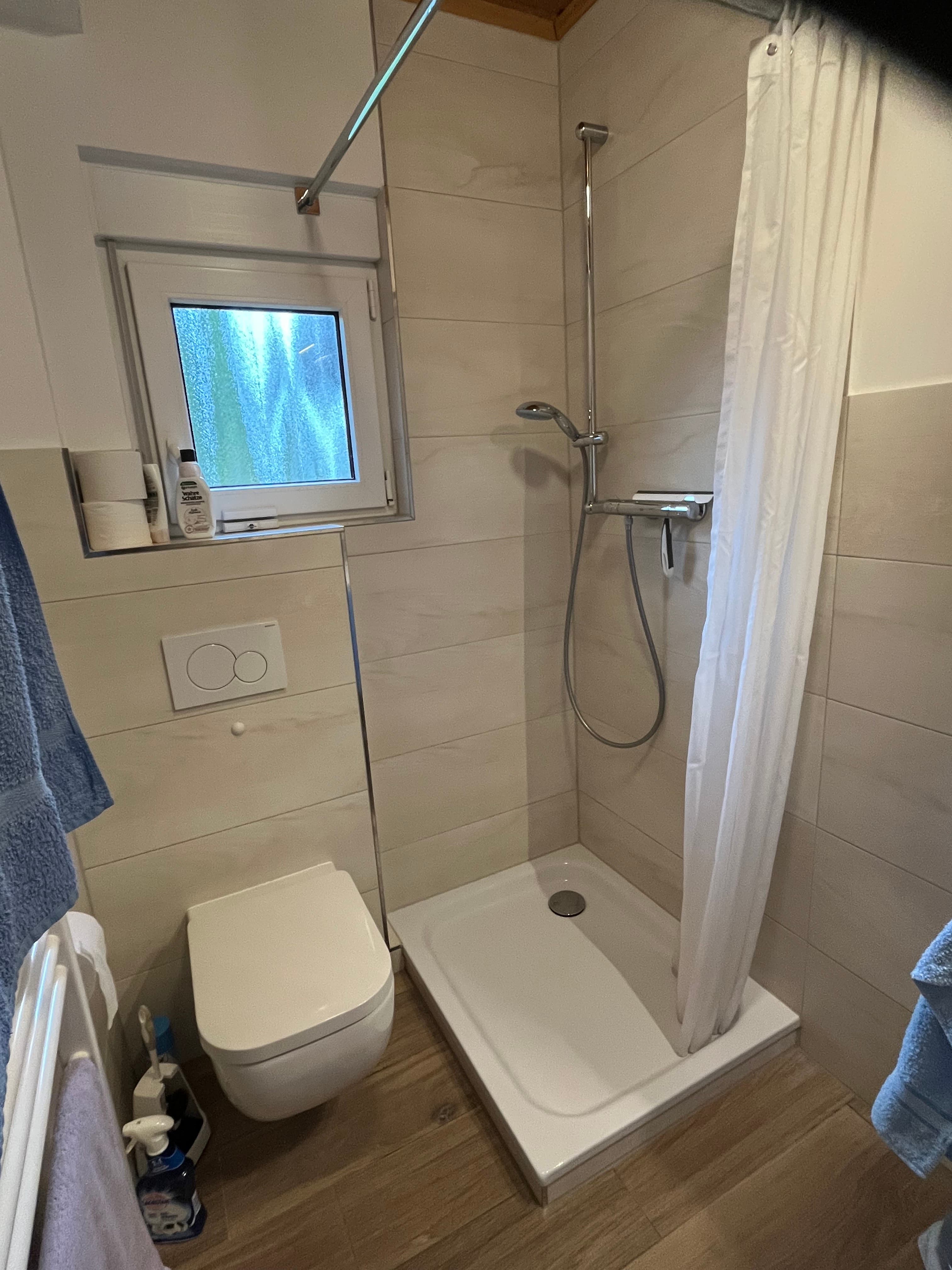 Das Bad ist mit WC, Waschtisch, Dusche ausgestattet.