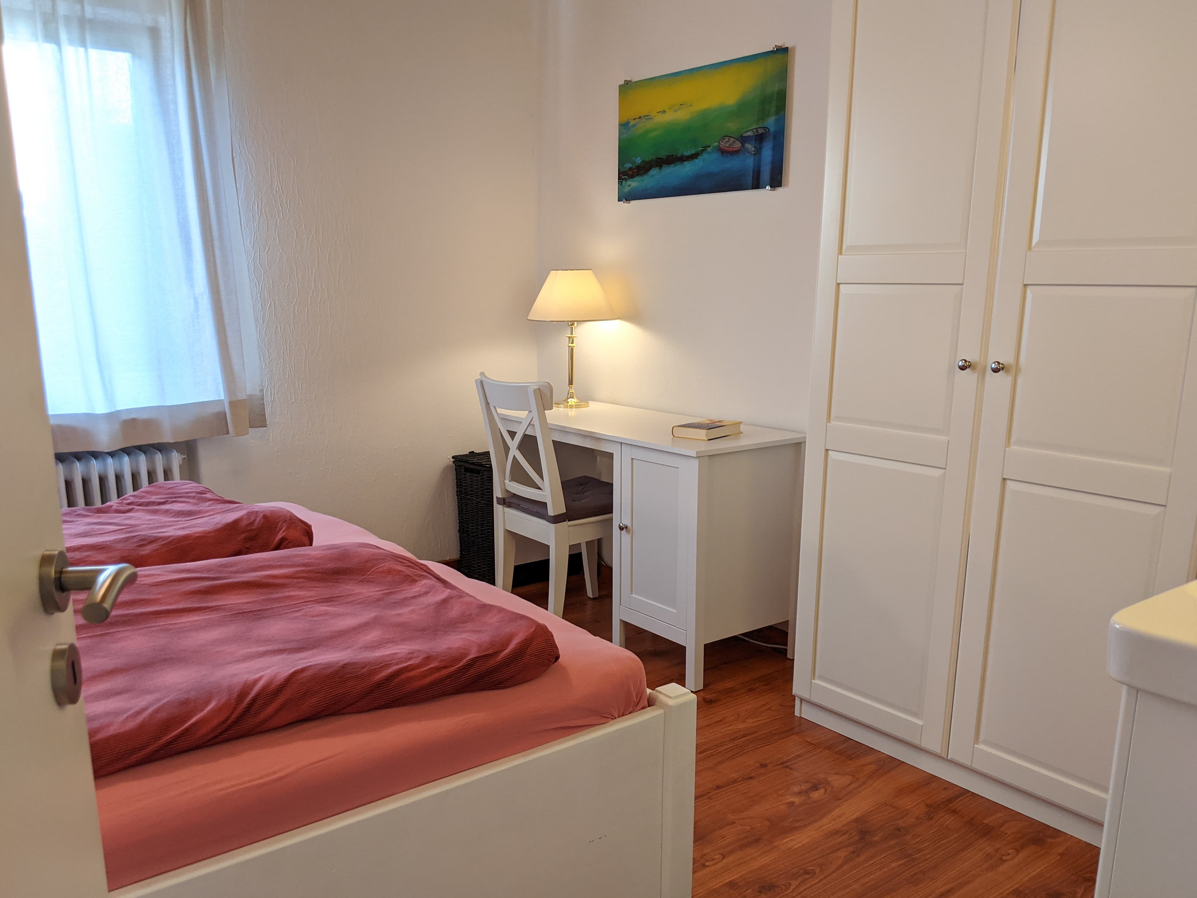 Doppelbett mit zwei Einzelmatratzen. Es steht ein großer Kleiderschrank