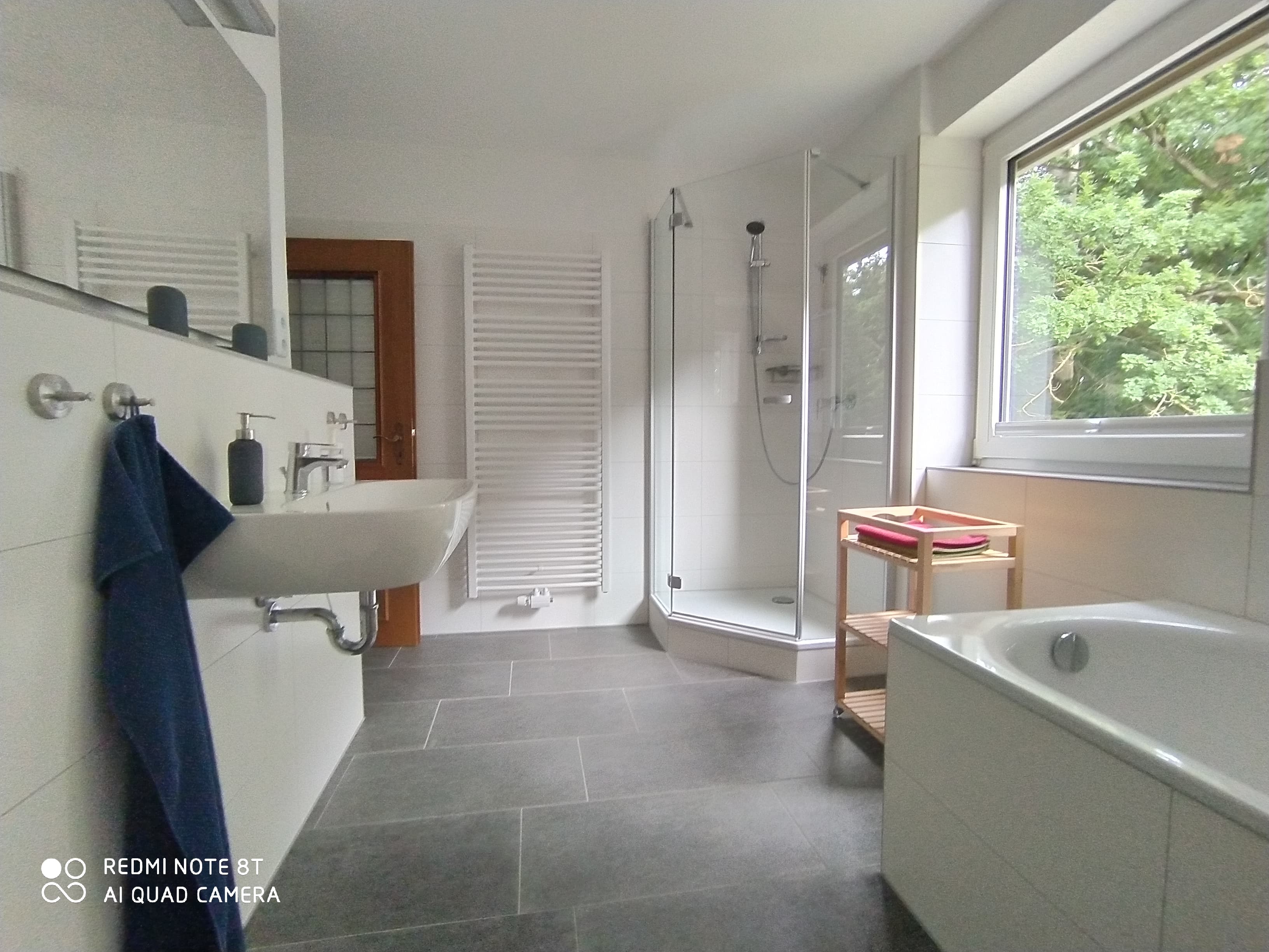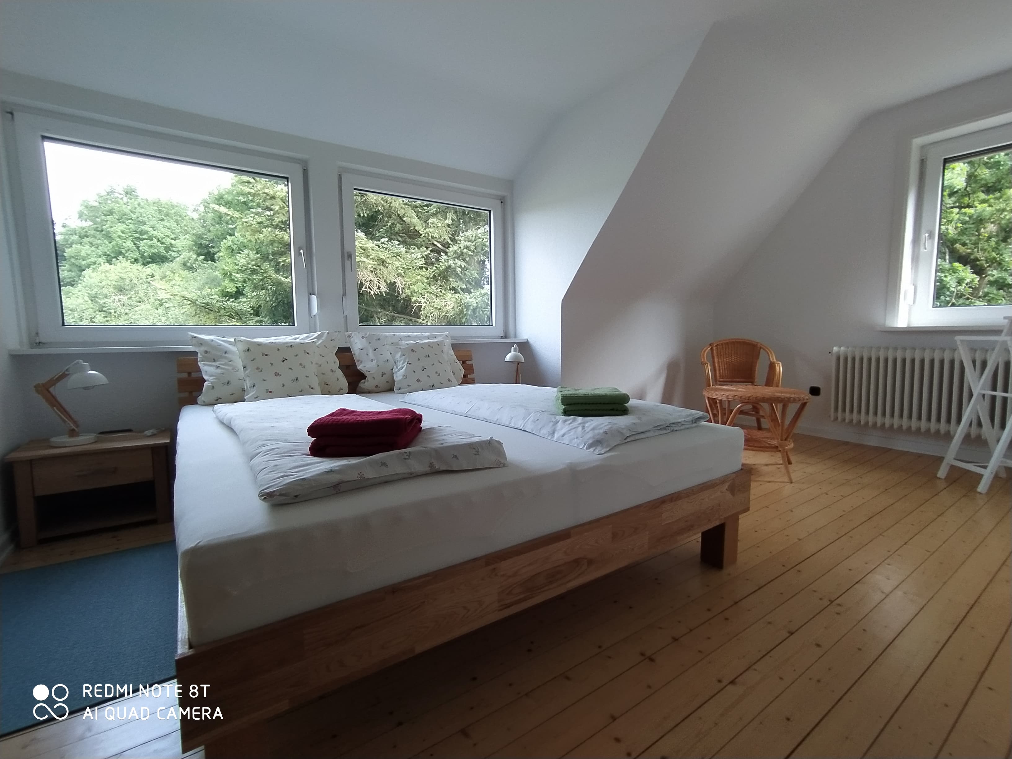 Die Ferienwohnung umfasst das gesamte Obergeschoss. Sie besteht aus zwei Schlafzimmern (davon eins mit direktem Zugang zum Balkon), einem geräumigen Bad mit Badewanne, Dusche und WC, einem "halben" Bad (dabei handelt es sich um eine geräumige Toilette, wo man auch mal am Waschbecken die Zähne putzen kann), einer Küche mit E-Herd, Backofen, Mikrowelle, Geschirrspüler und Kühl-/Gefrierschrank und dem großen Wohnzimmer mit Balkon.