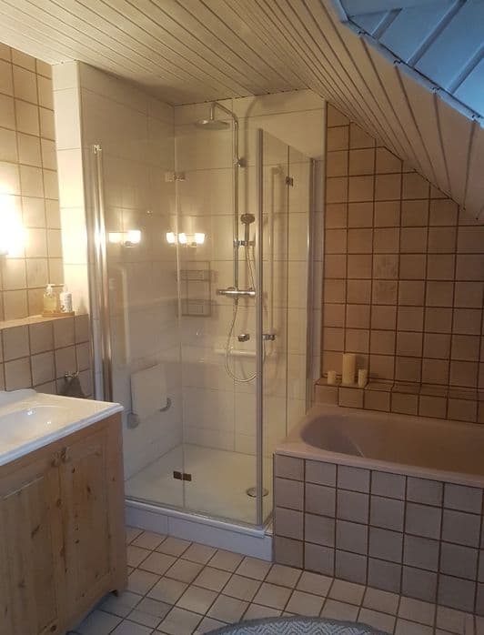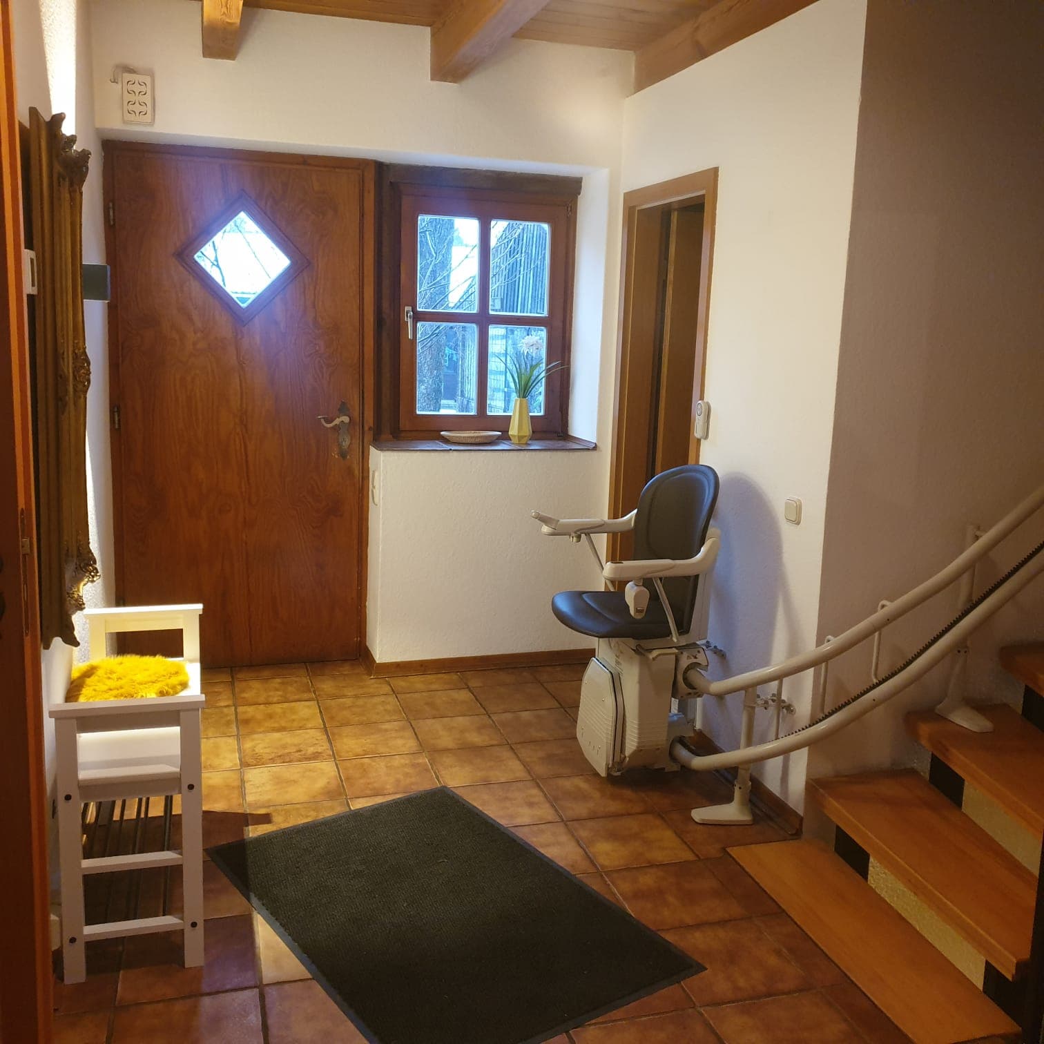 Das Haus bietet zudem eine teilweise altersgerechte Ausstattung. Im Bad ist eine ebenerdige Dusche mit Sitz und Haltegriff. Außerdem haben wir einen Treppenlift um in den ersten Stock zu kommen.