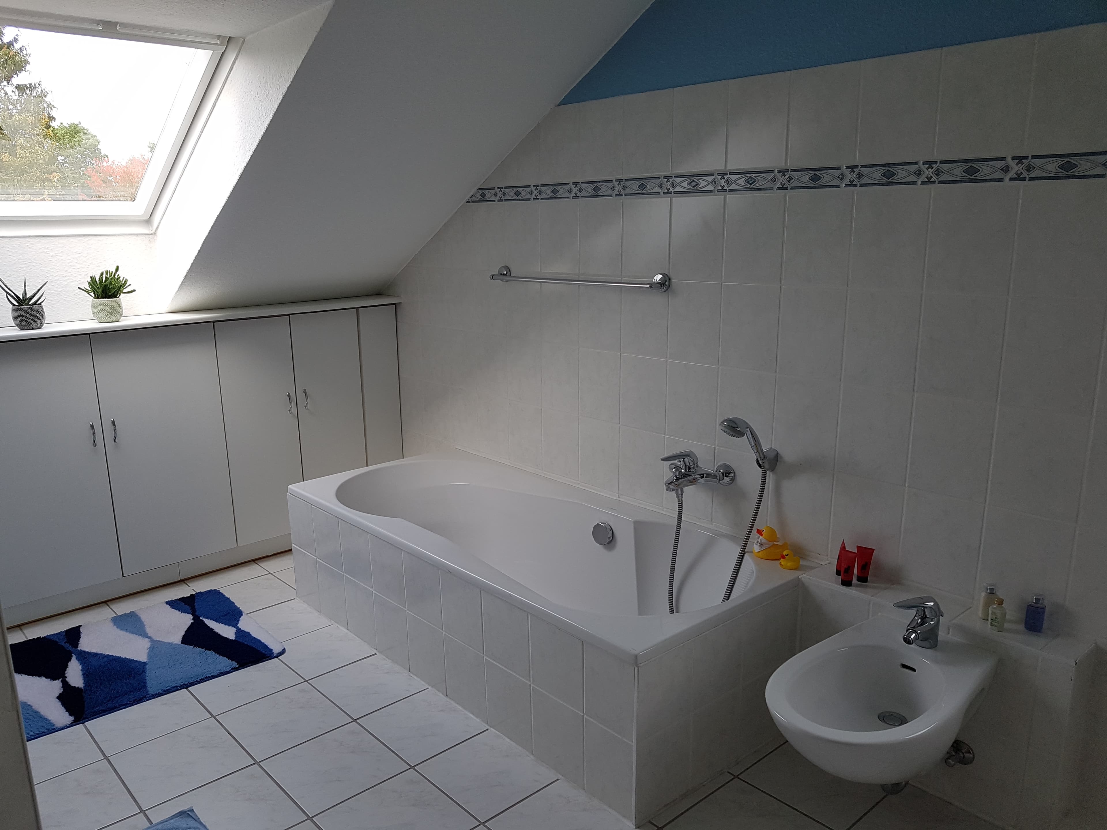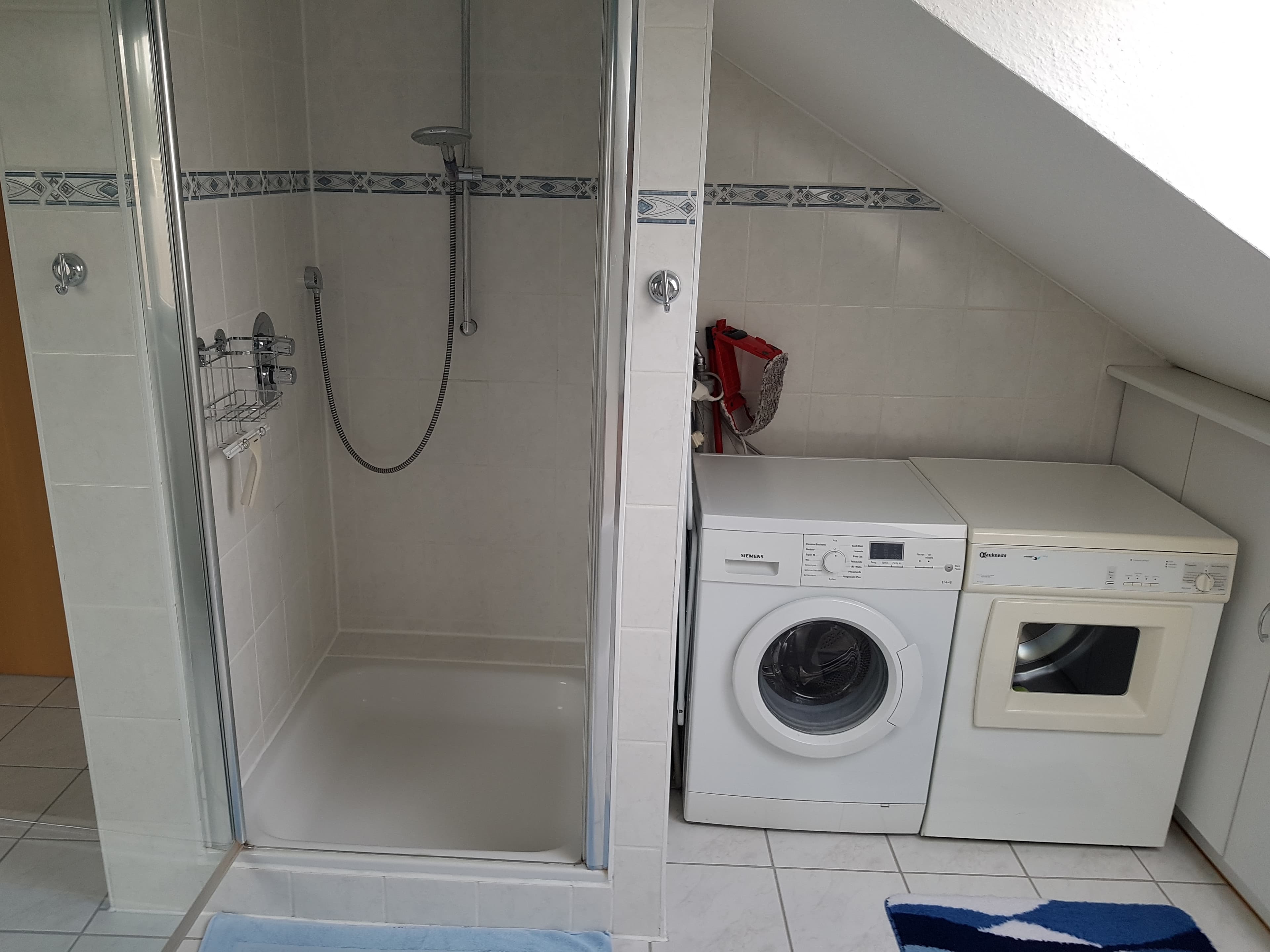Im Badezimmer sind eine Dusche, ein Bidet und eine Badewanne vorhanden. Die Dusche ist nicht ebenerdig montiert, aber über einen flachen Einstieg zu erreichen. Waschmaschine und Trockner sind ebenfalls im Badezimmer.