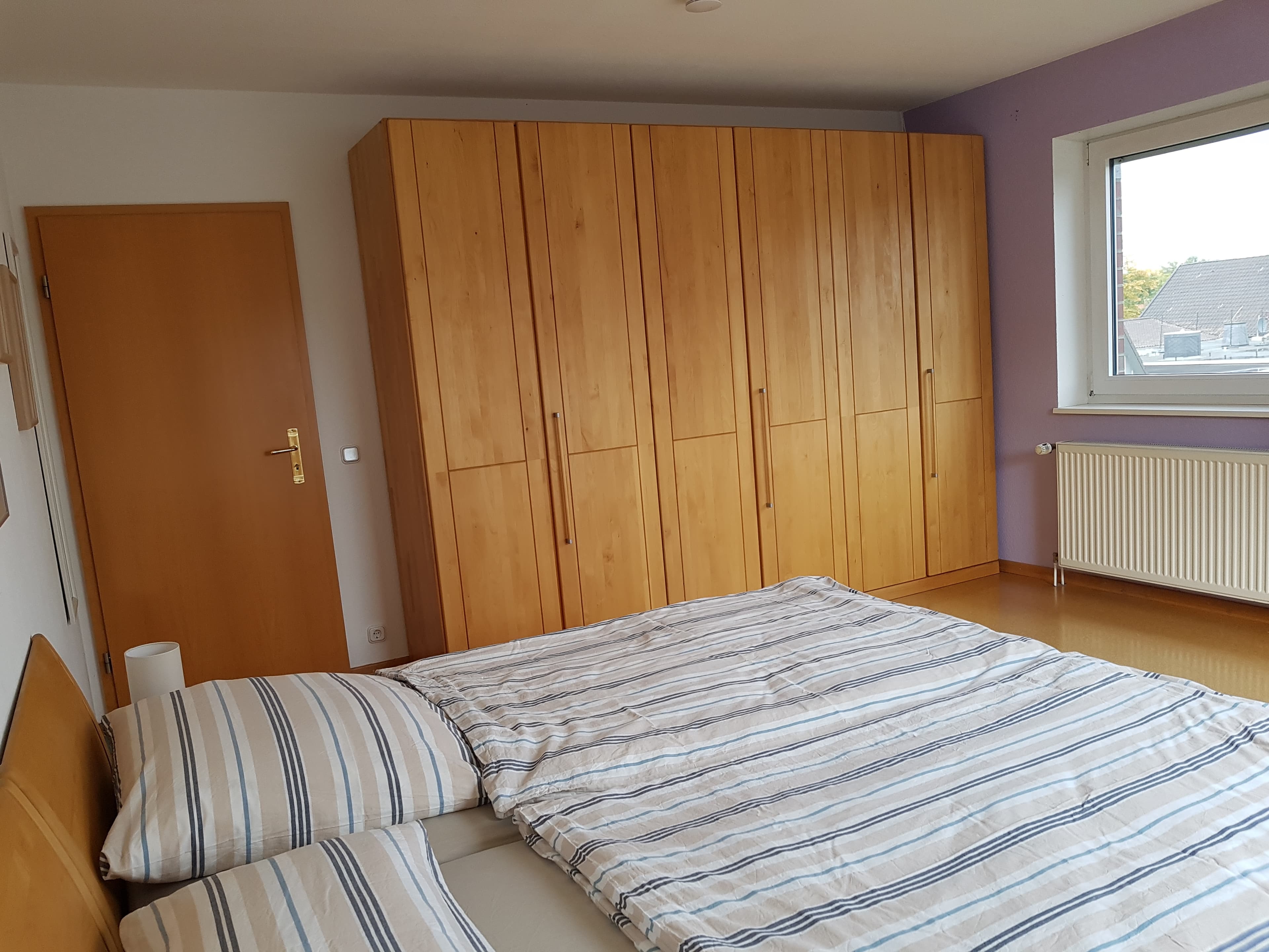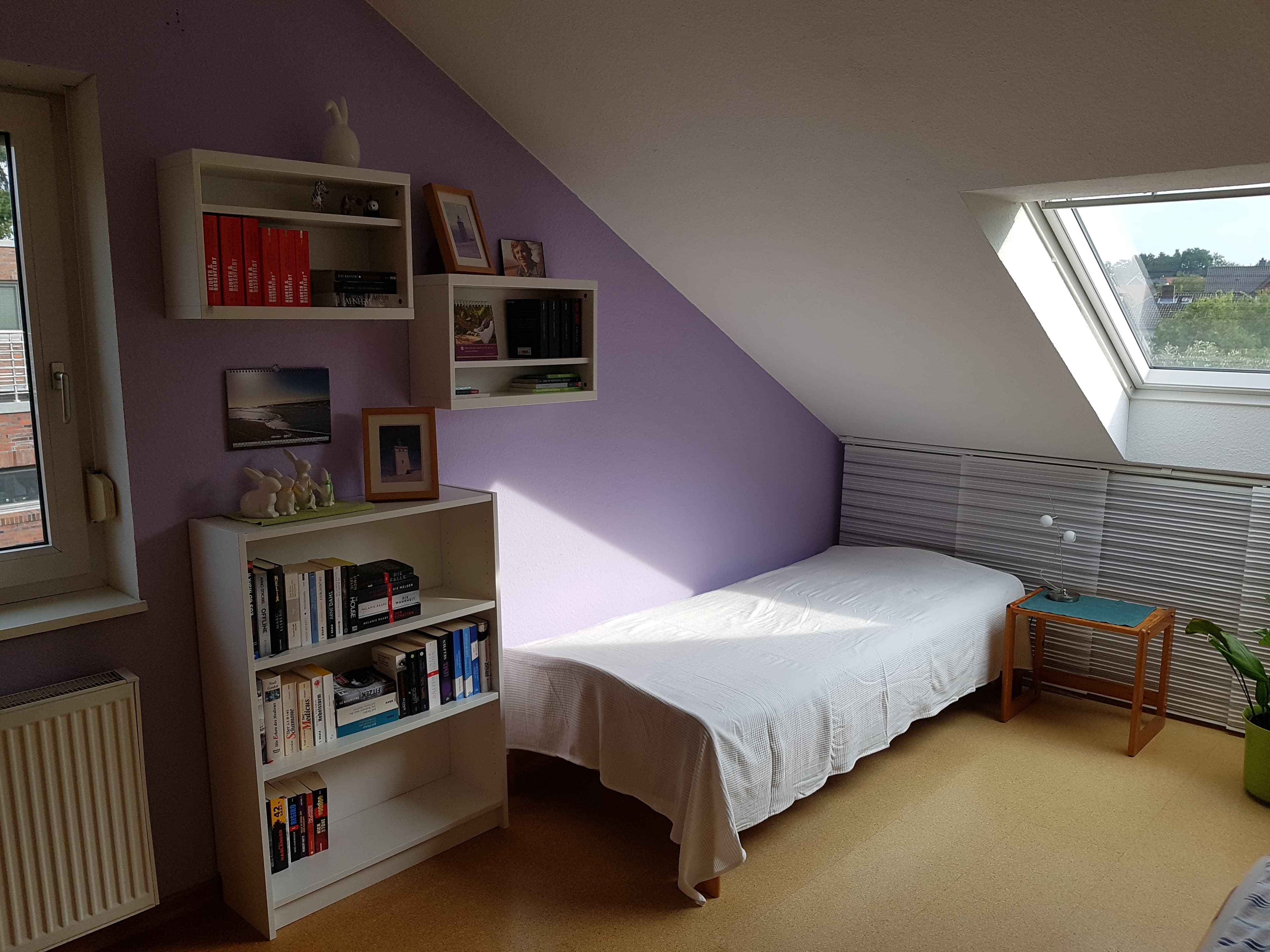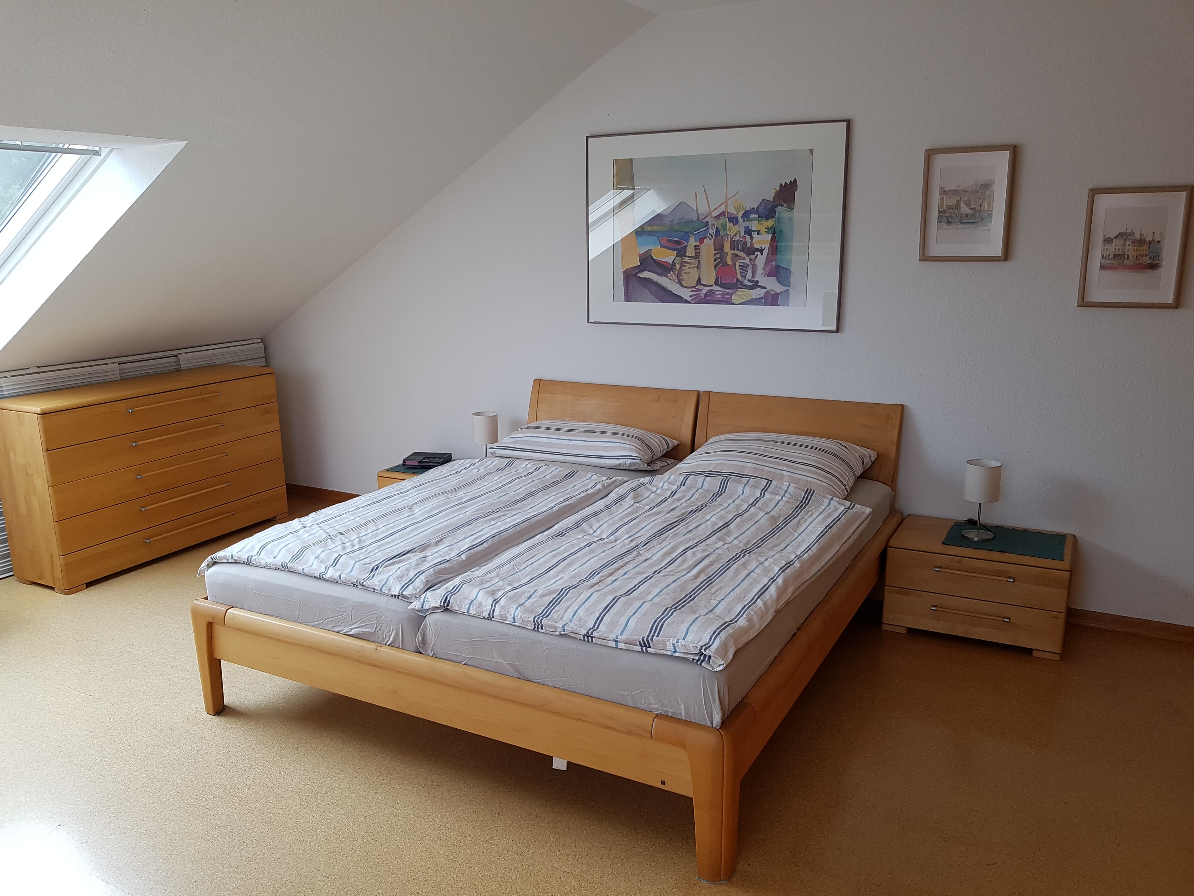 Das gemütliche Ehebett (180 x 200) im Schlafzimmer sorgt für angenehme Nächte. Ein zusätzliches Einzelbett (90 x 200) kann für eine dritte Person genutzt werden. Auf Wunsch kann das Einzelbett auch vorübergehend abgebaut werden.