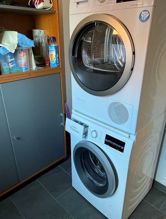 Ein praktischer Hauswirtschaftsraum ist mit Waschmaschine und Trockner sowie Reinigungsutensilien ausgestattet. Für angenehme Wärme sorgt die Fußbodenheizung, die im gesamten Haus installiert ist.