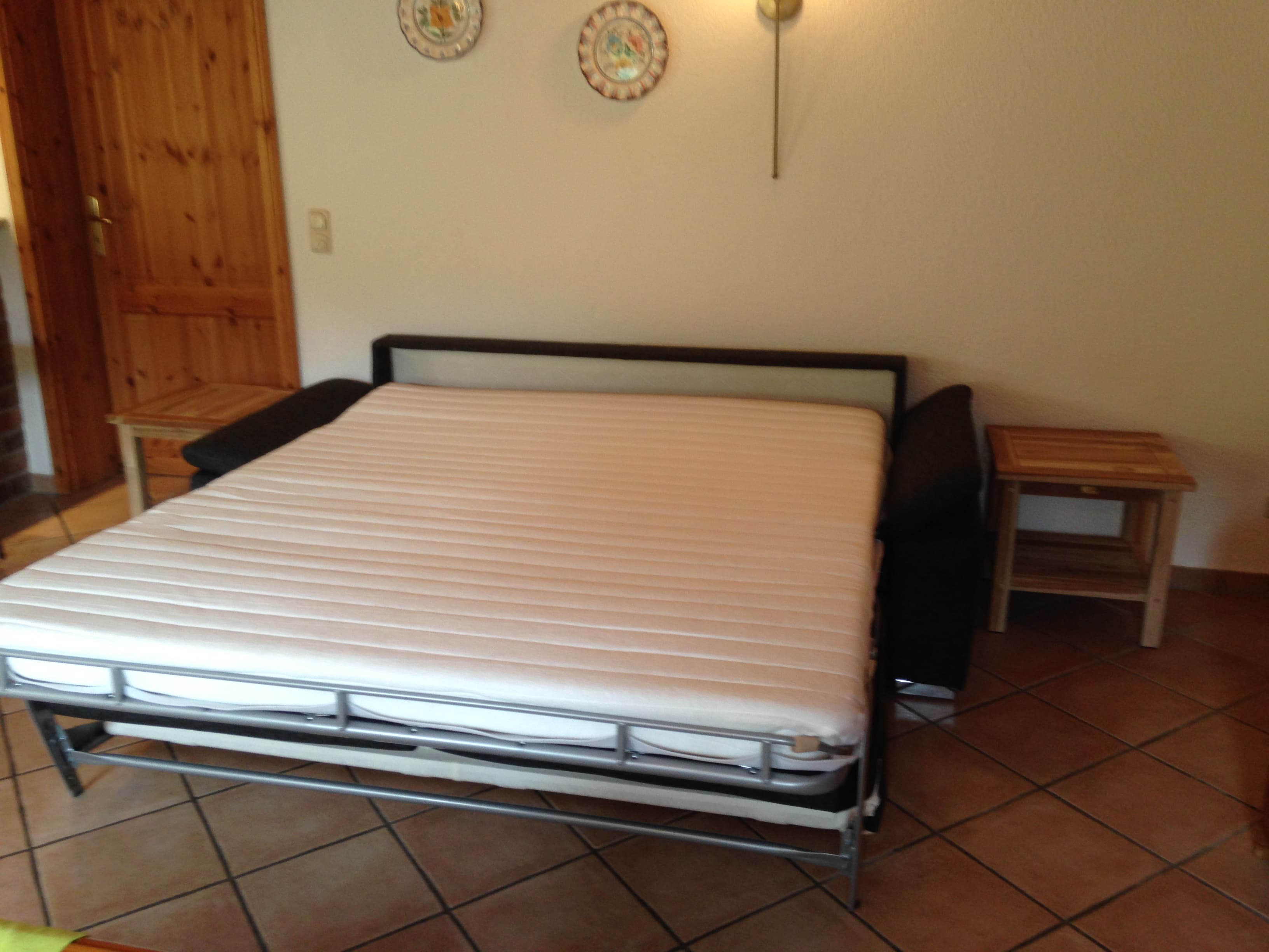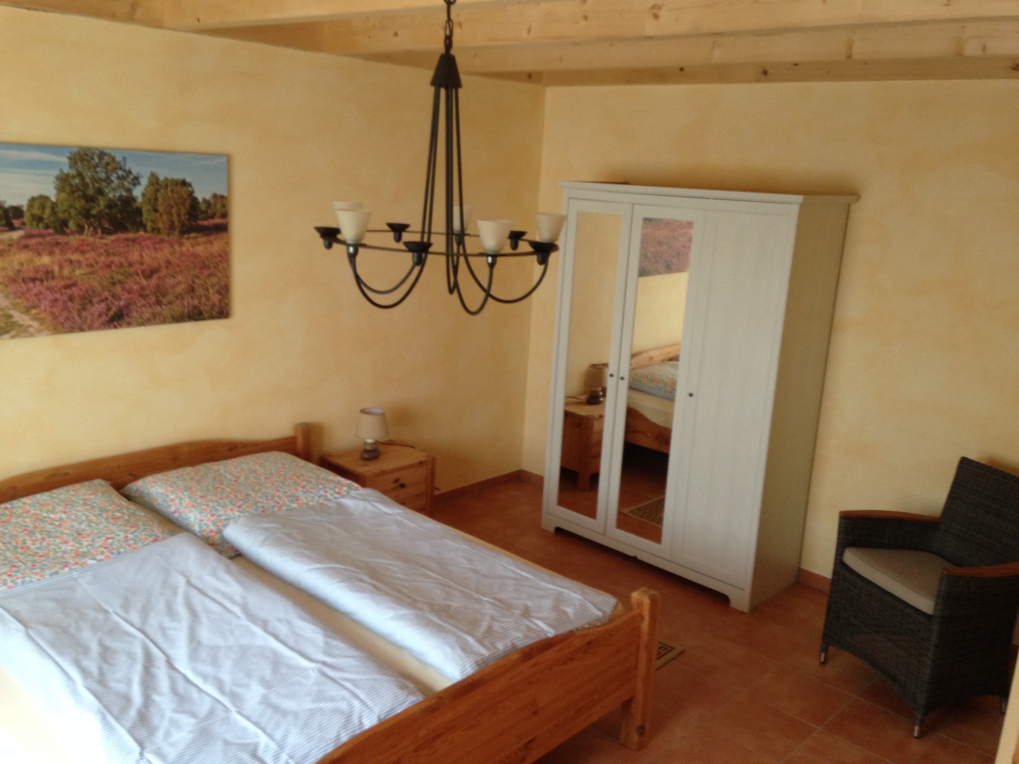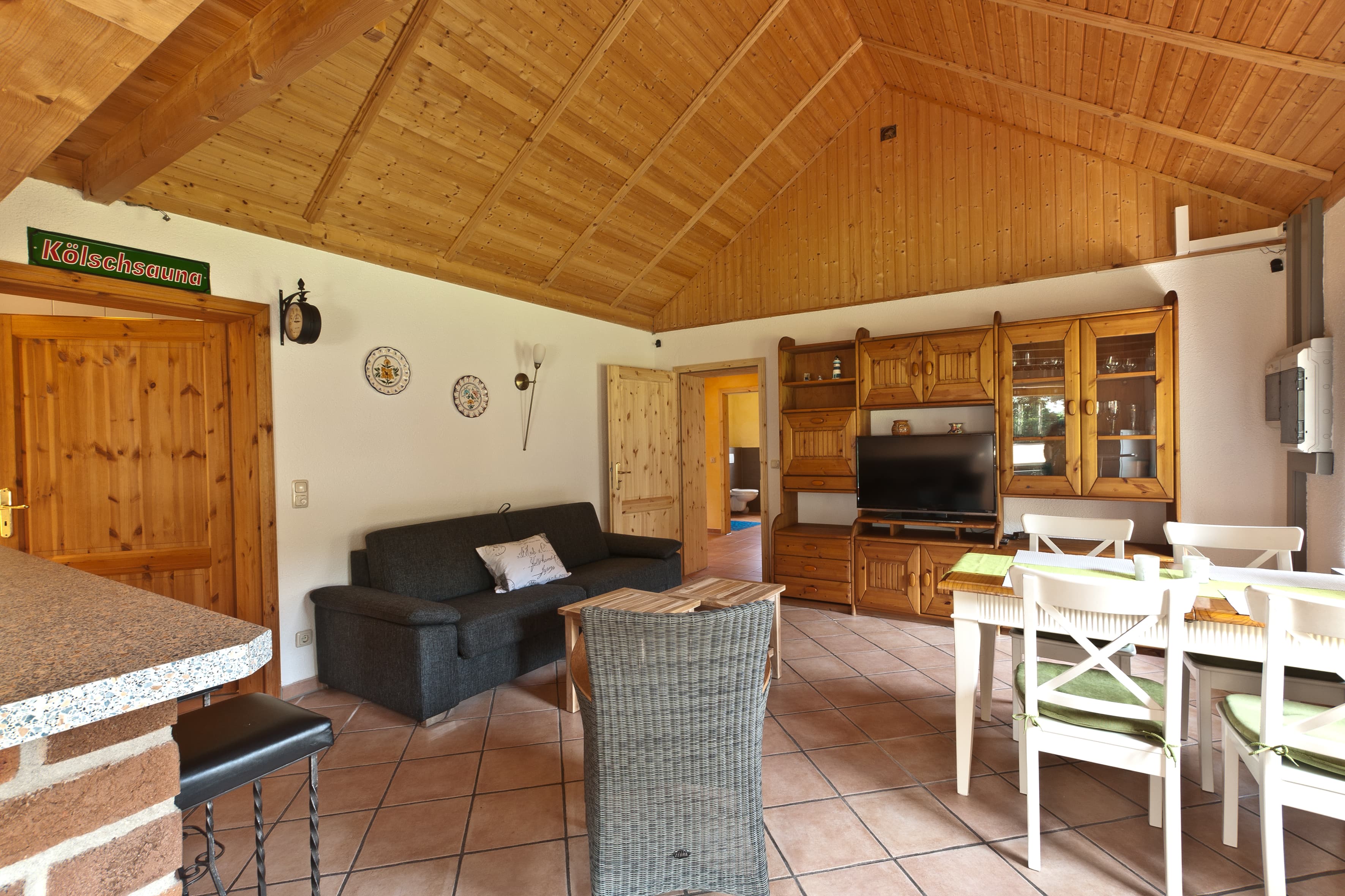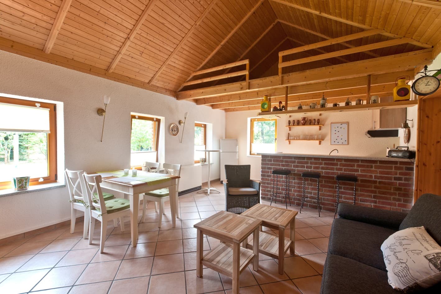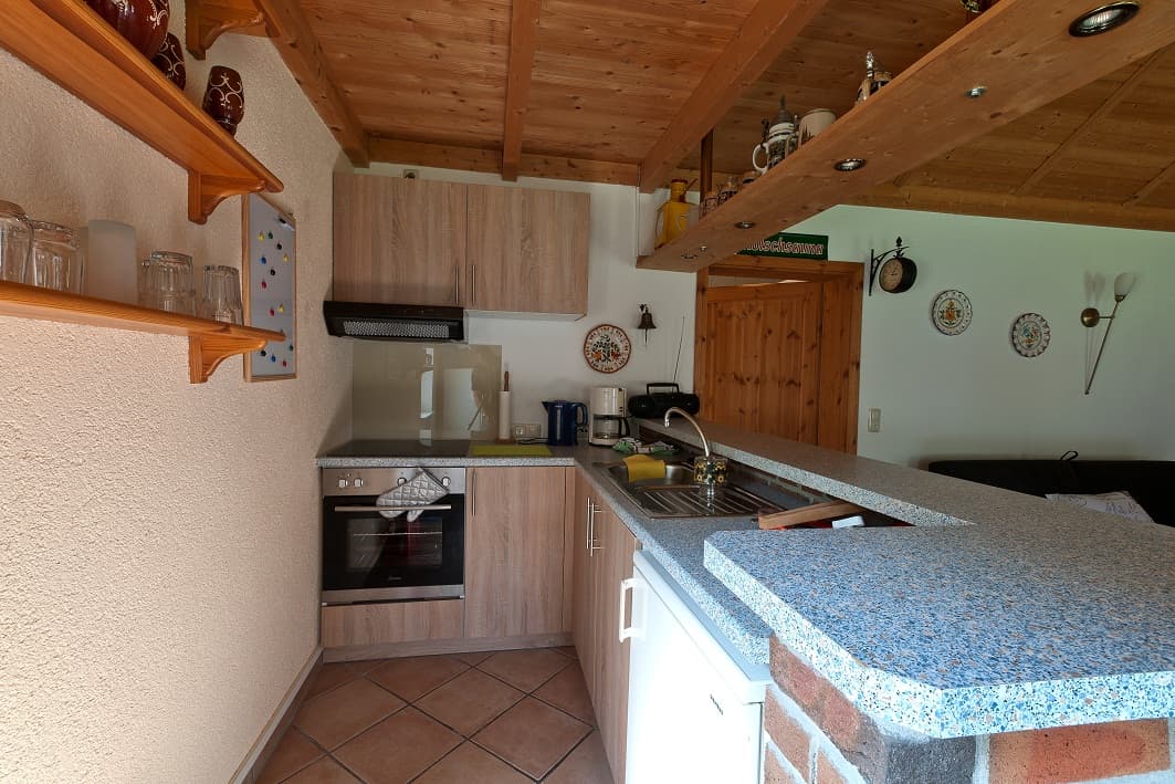 Das Ferienhaus verfügt über einen großzügigen Wohnbereich mit Flachbildfernseher sowie Blu-ray/DVD Player, eine gut ausgestattete Küchenzeile abgetrennt durch einen gemauerten Tresen, ein Schlafzimmer mit Doppelbett. Im WZ befindet sich eine weitere Schlafmöglichkeit für zwei Personen (180cm breites Schlafsofa mit Kaltschaummatratze).