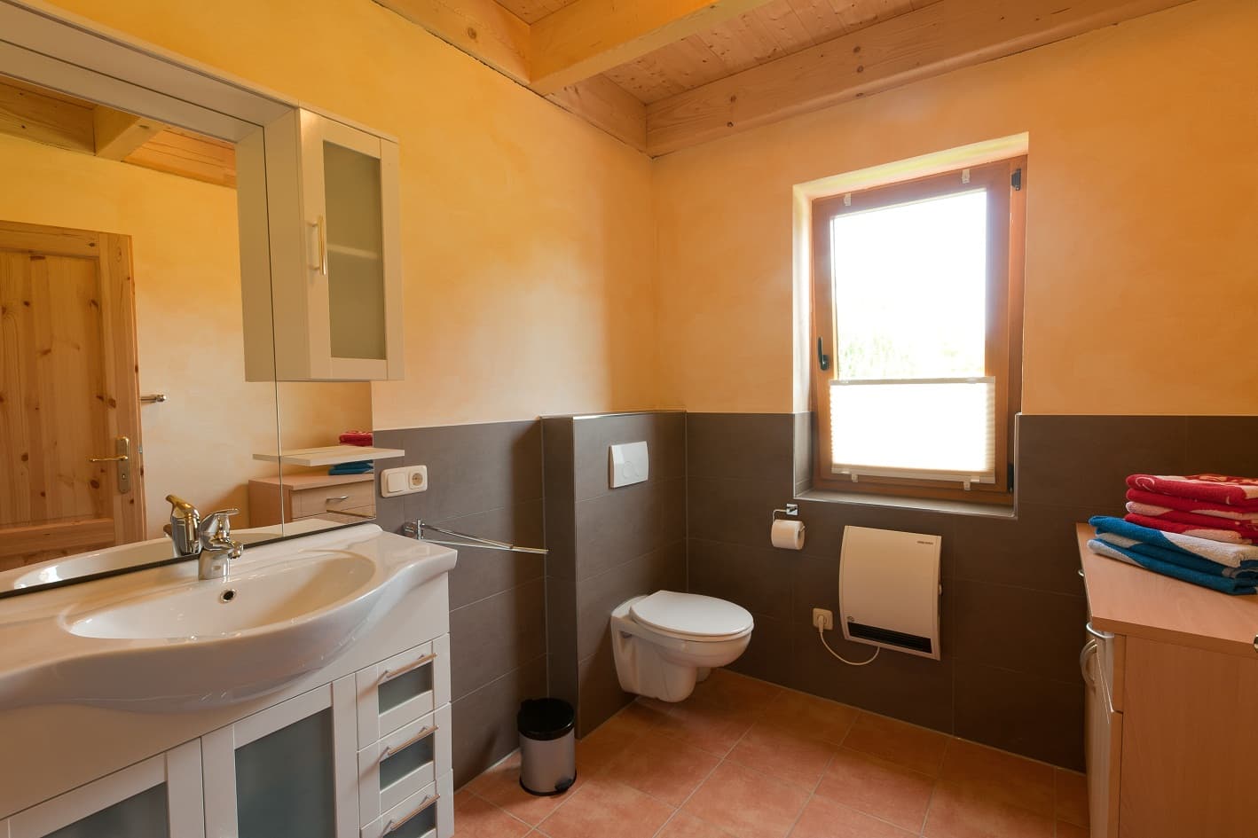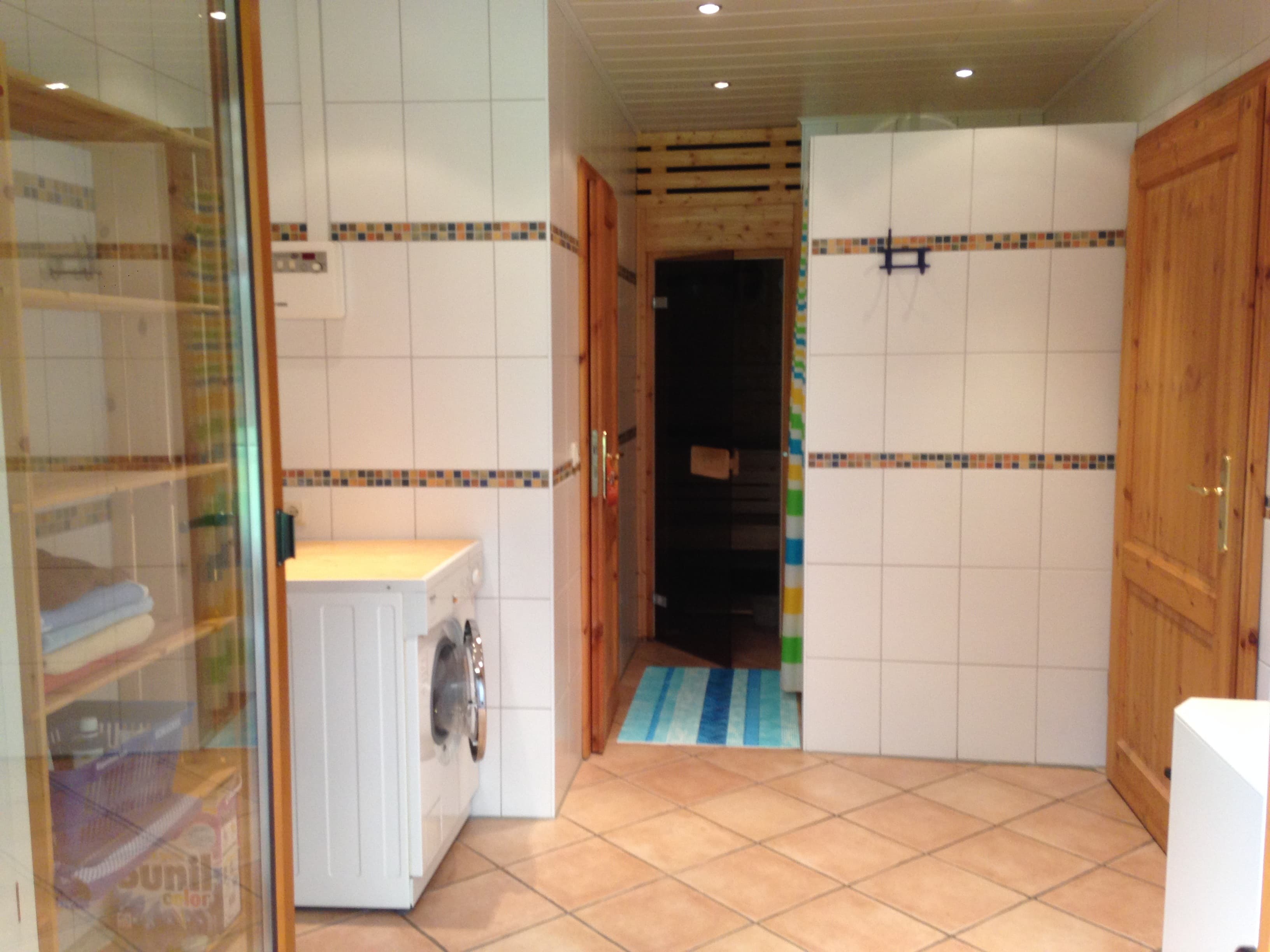 Es gibt zwei Bäder, eines mit WC und Waschtisch, das andere mit WC, Dusche, Sauna