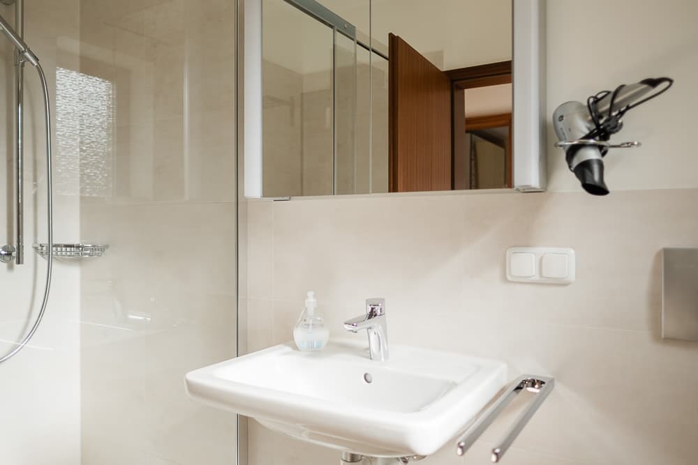 - Das Bad ist mit einer großen, bodentiefen Dusche, WC und einem Föhn ausgestattet