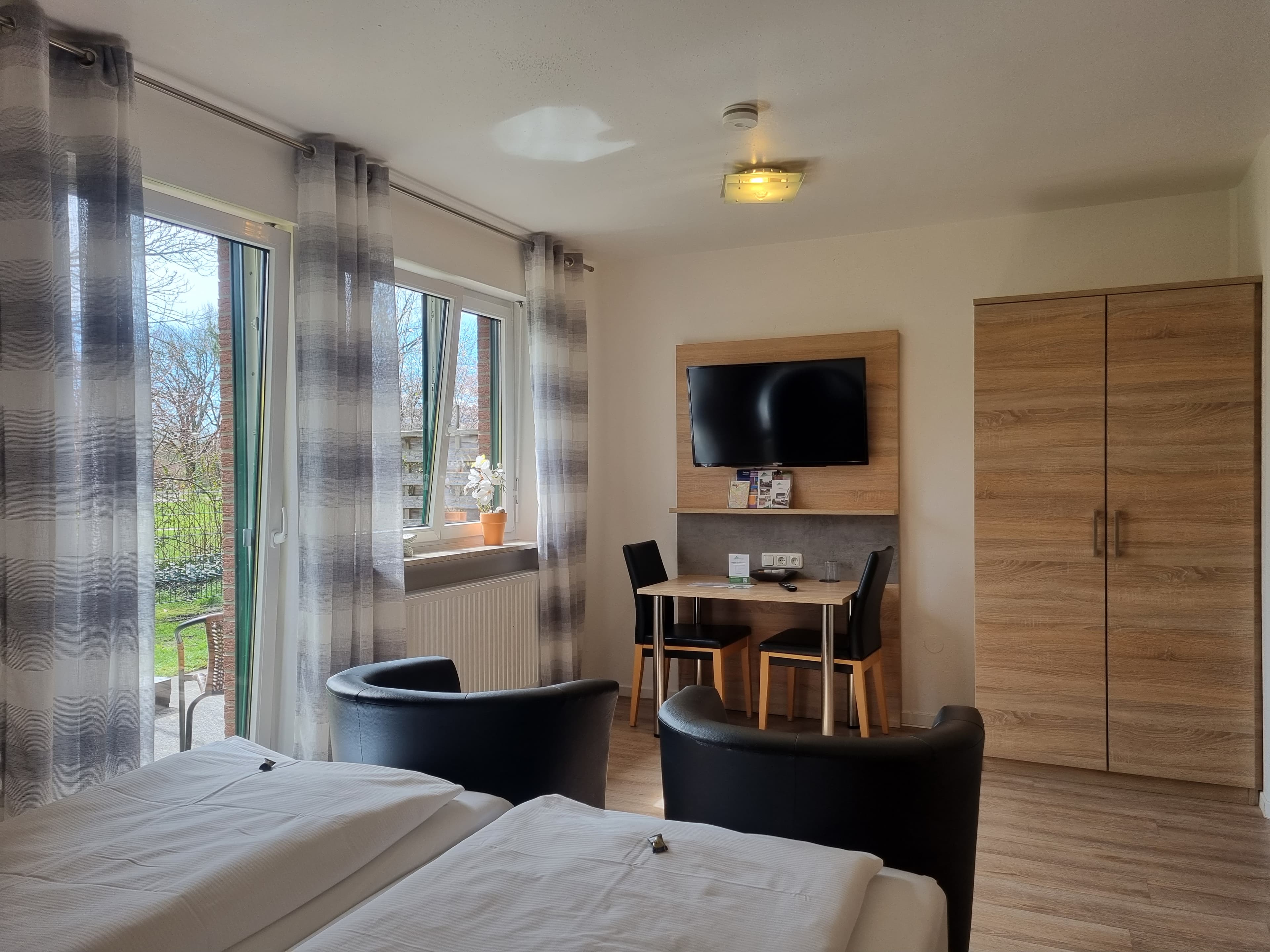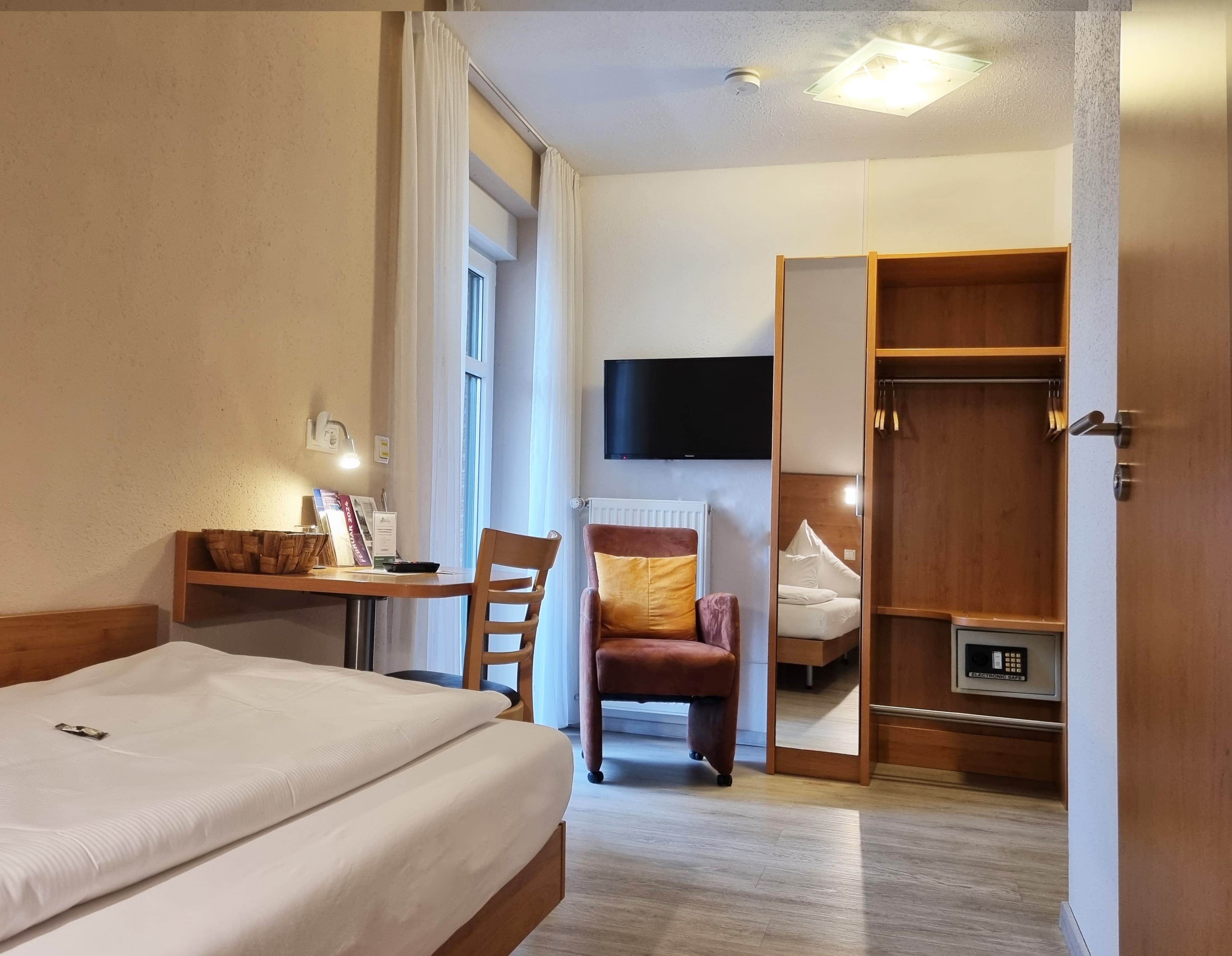 EIn Willkommentablett zur kostenfreien mit Kaffe- und Teezubereitung erwartet Sie. Die Ausstattung unserer Zimmer beinhaltet einen Schreibtisch, gemütliche Sitzgelegenheiten, TV, kostenfreies WLAN, Föhn und Duschbad, sowie Handtücher und weiße Bettwäsche.