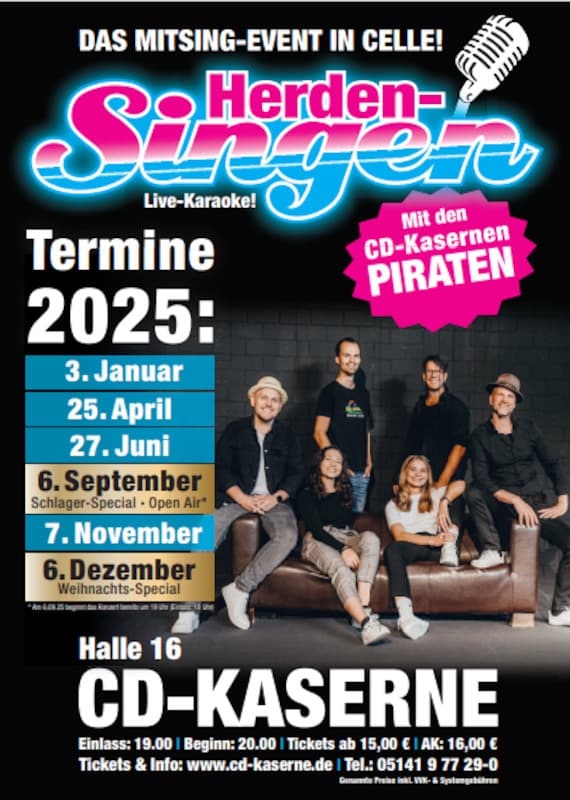 Gemeinsam mit dem Team der CD-Kaserne die Hits verschiedener Jahrzehnte lauthals mitsingen – das ist Herdensingen! Ein Spaß für alle, bei dem die Liedtexte gut sichtbar auf Großbildleinwand projiziert werden, sodass wirklich jeder mitsingen kann. Und musikalisch begleitet wird das Publikum dabei von der, extra dafür gegründeten Band, bestehend aus Teammitgliedern der CD-Kaserne. „Die CD-Kasernen Piraten“.
