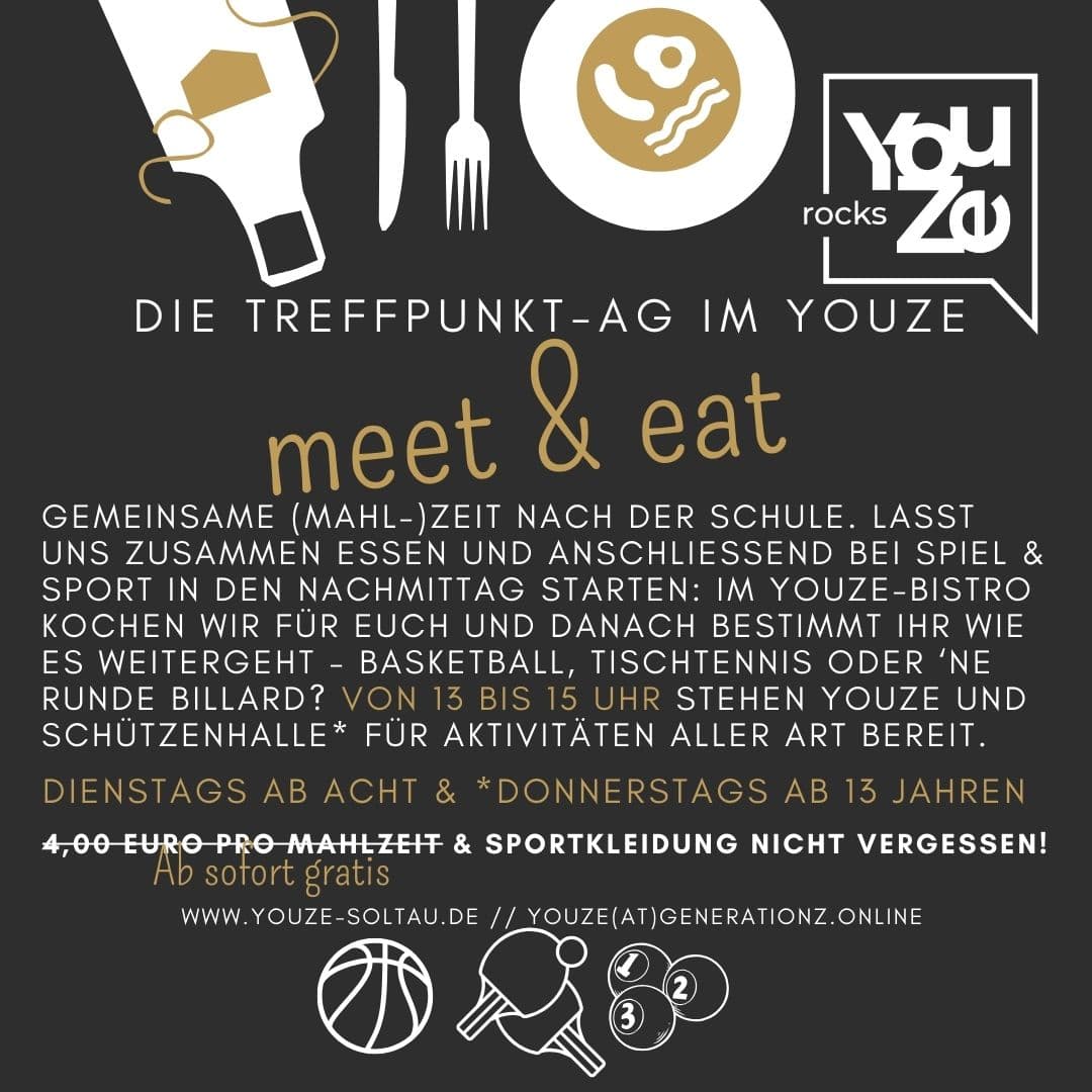 GEMEINSAME (MAHL-)ZEIT NACH DER SCHULE. LASST UNS ZUSAMMEN ESSEN UND ANSCHLIESSEND BEI SPIEL & SPORT IN DEN NACHMITTAG STARTEN: IM YOUZE-BISTRO KOCHEN WIR FÜR EUCH UND DANACH BESTIMMT IHR WIE ES WEITERGEHT - BASKETBALL, TISCHTENNIS ODER 'NE RUNDE BILLARD?