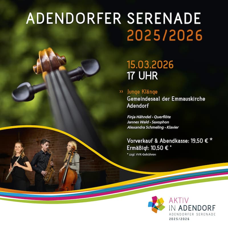 Finja Hähndel (Querflöte), Jannes Wald (Saxophon) und Alexandra Schmeling (Klavier) präsentieren ein abwechslungsreiches Programm mit Werken von Komponisten wie Carl Reinecke, Francis Poulenc bis hin zu Russell Peterson. Doch damit nicht genug: Ein besonderes Highlight des Abends werden die eigenen, ausdrucksstarken Kompositionen des Saxophonisten sein - Musik von heute, direkt aus