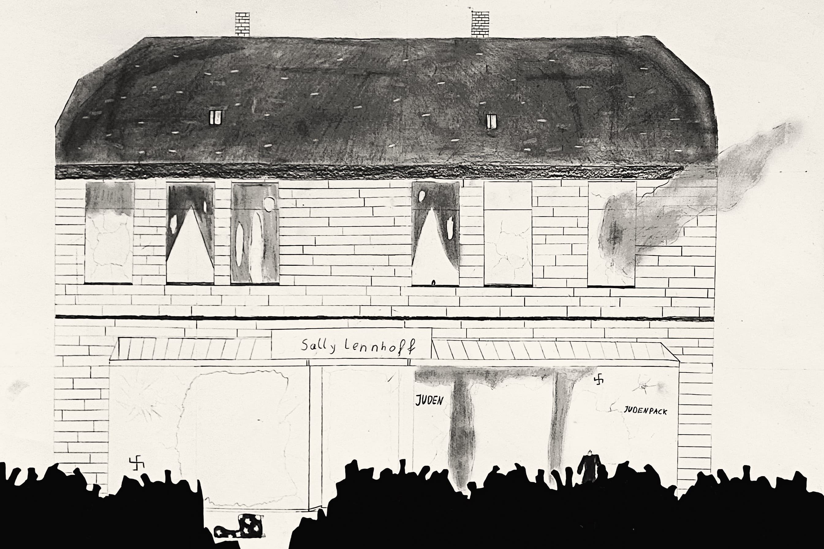 Menschenmenge vor dem gestürmten Gebäude Marktstraße 8, Arbeit der Schülerin Josephine