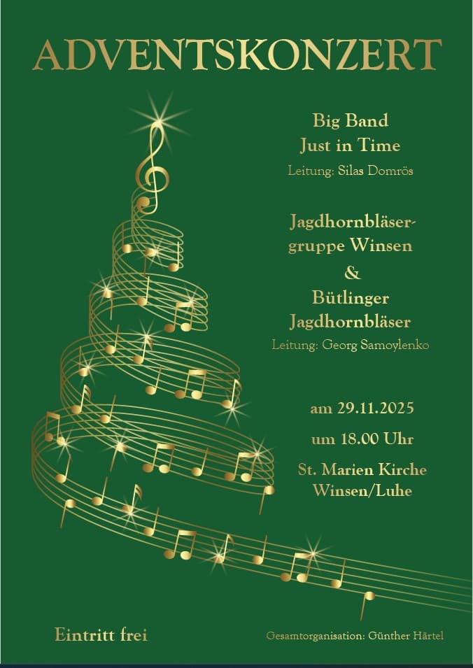 Just In Time, unter der musikalischen Leitung von Silas Domrös, sowie die Jagdhornbläsergruppe Winsen und Bütlinger Jagdhornbläser, unter der Leitung von Georg Samoylenko, haben ein stimmungsvolles Programm vorbereitet. Die Gesamtorganisation des Abends liegt bei Günther Härtel.
