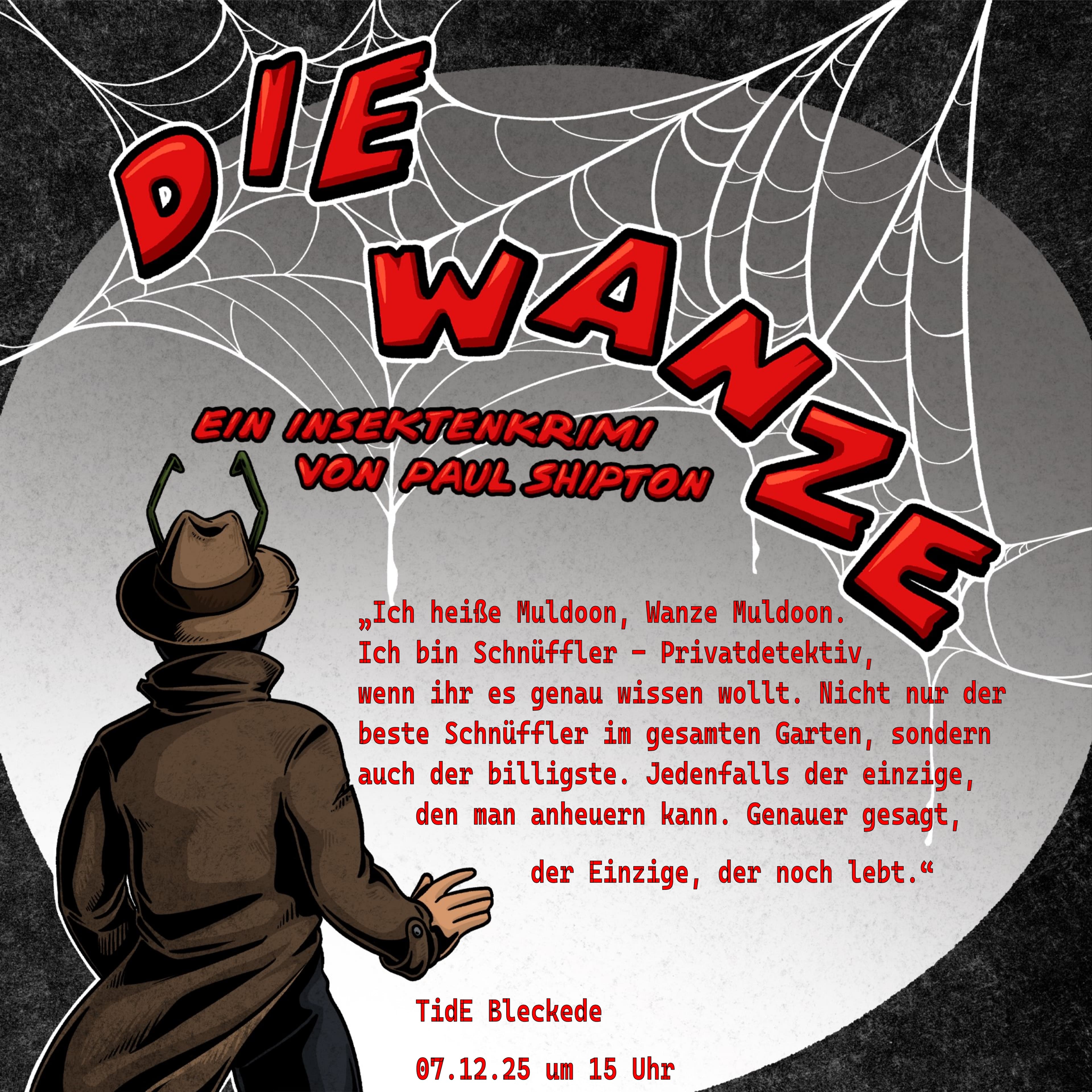 Wanze Muldoon ist eigentlich ein ganz normaler Käfer und wie er zu seinem Namen „Wanze“ kam, das scheint eine endlose Geschichte zu sein. Auf jeden Fall ist er – wie viele bekannte Größen seines Berufes – ein bisschen „schäbig“, aber schlagfertig, mutig und vor allem ziemlich cool. In seinem ersten Fall stößt er auf ungewöhnliche Vorfälle im Ameisenstaat…