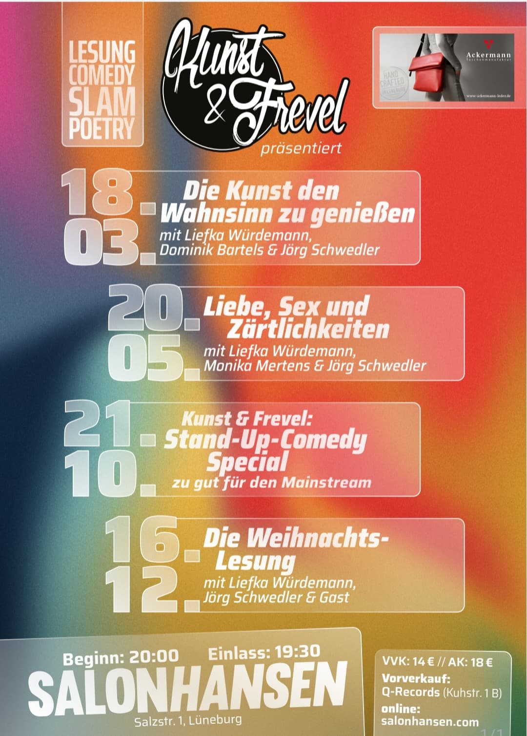 Kaum zeigt sich der Mai von seiner freundlichen Seite, wird es auch bei „Kunst & Frevel“ wieder wärmer – und zwar nicht nur wegen der Temperaturen. Die Spezial-Lesung „Liebe, Sex und Zärtlichkeit“ bringt frischen Wind, rote Ohren und eine ordentliche Portion Humor auf die Bühne. Am Mittwoch, den 20. Mai, startet das Ganze um 20 Uhr im Salon Hansen in Lüneburg.