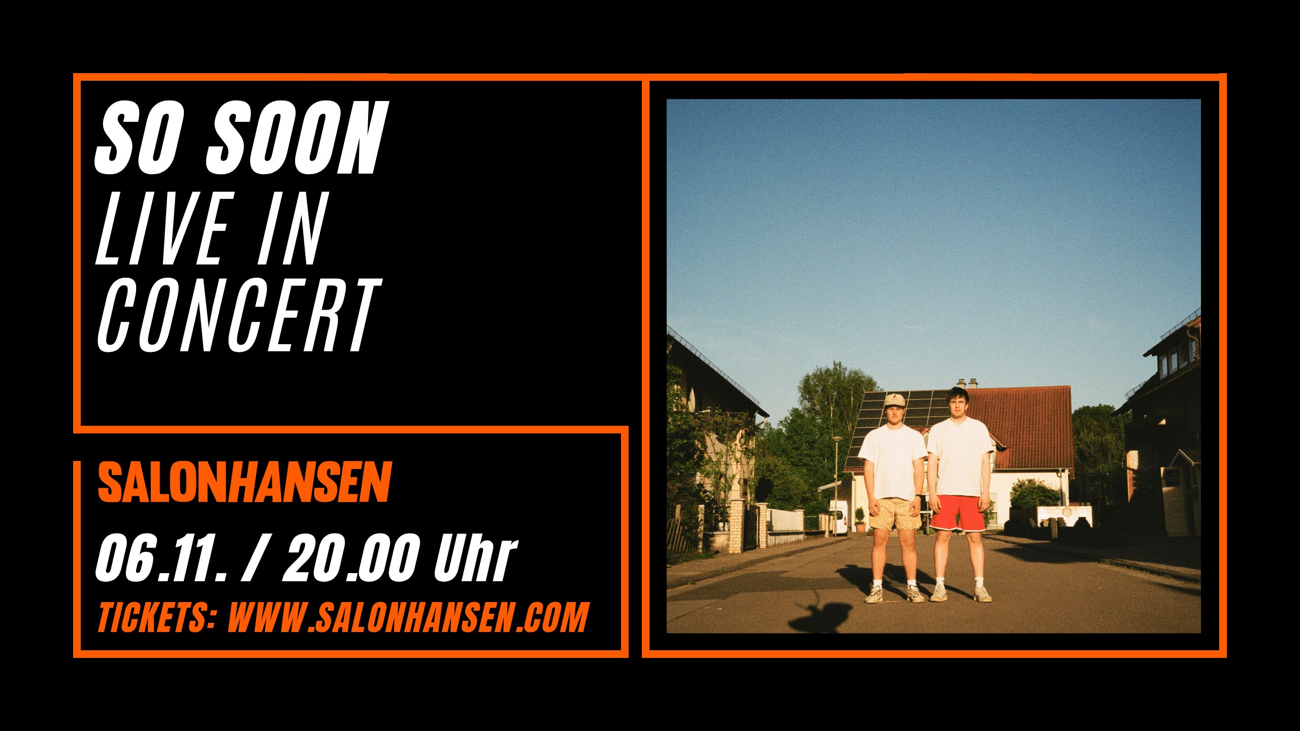 LüneburgSongs mit fesselnder Tiefe, beeindruckende Vocals in schwereloser Harmonie, coming of age inreverb. DATUM: 06.11. BEGINN: 20.00 (EINLASS: 19.30) EINTRITT: 22€ / 16€ ermäßigt TICKETS: https://salonhansen.com ALTER: ab 16 Jahren So Soon um die Multiinstrumentalisten, Songwriter und Producer Davi…