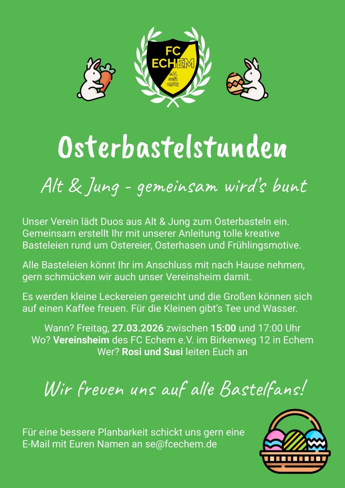 EchemUnser Verein lädt Duos aus Alt & Jung (egal ob Großeltern mit Enkel, Eltern mit Kindern, Tanten/Onkel mit Nichten/Neffen, Nachbar und Nachbarskind - alle Konstellationen sind herzlich willkommen) zum Osterbasteln ein.