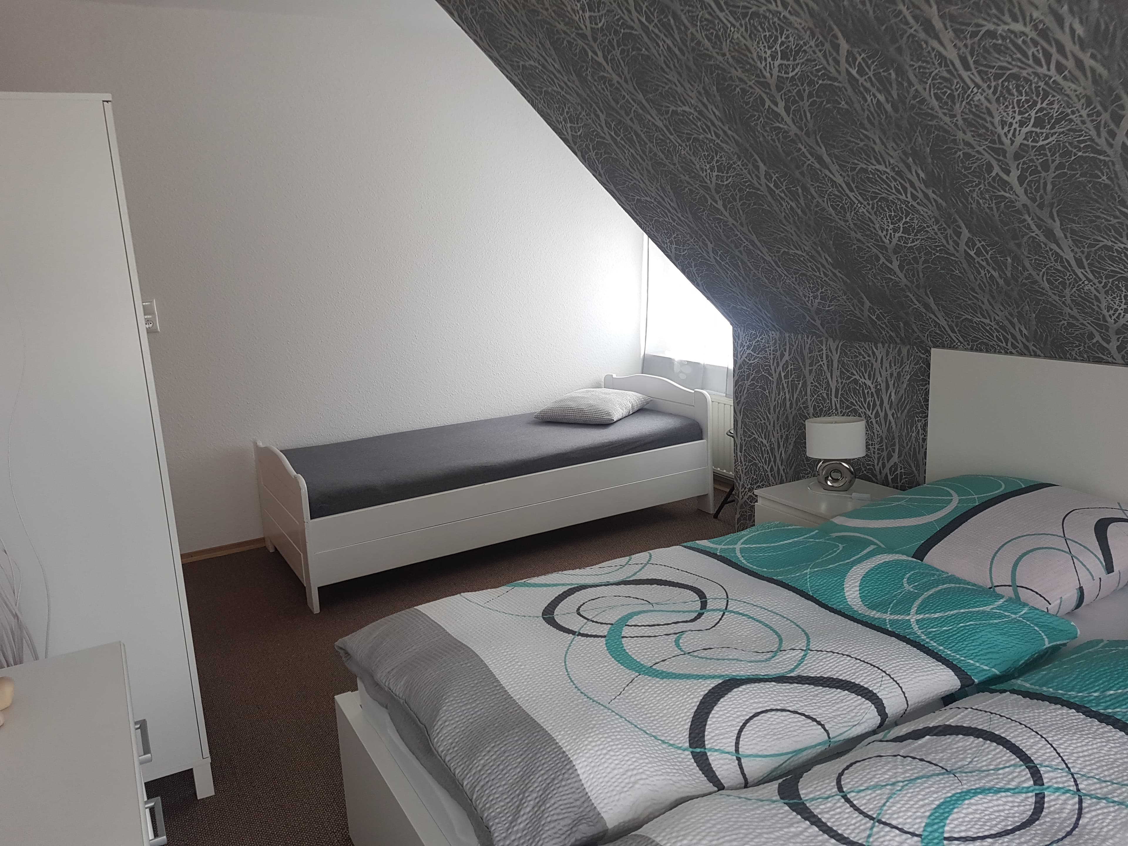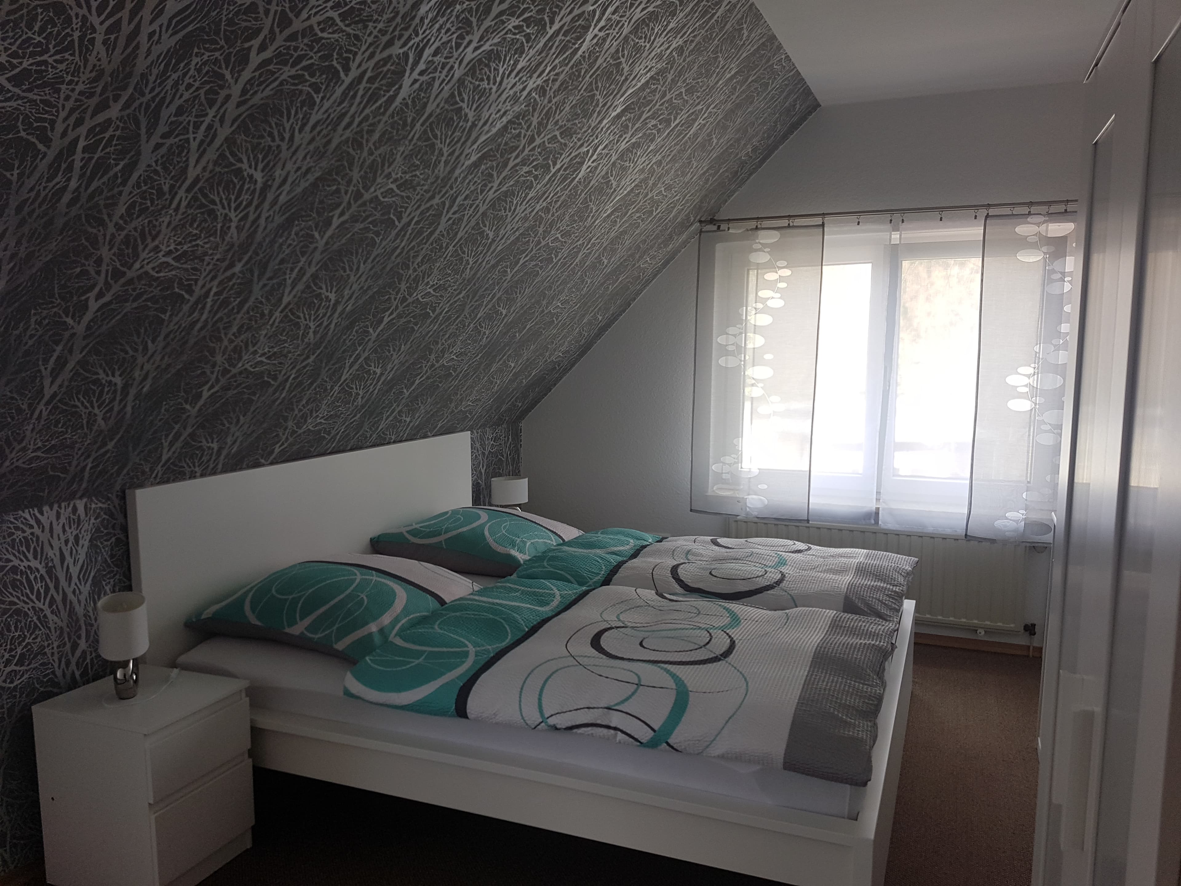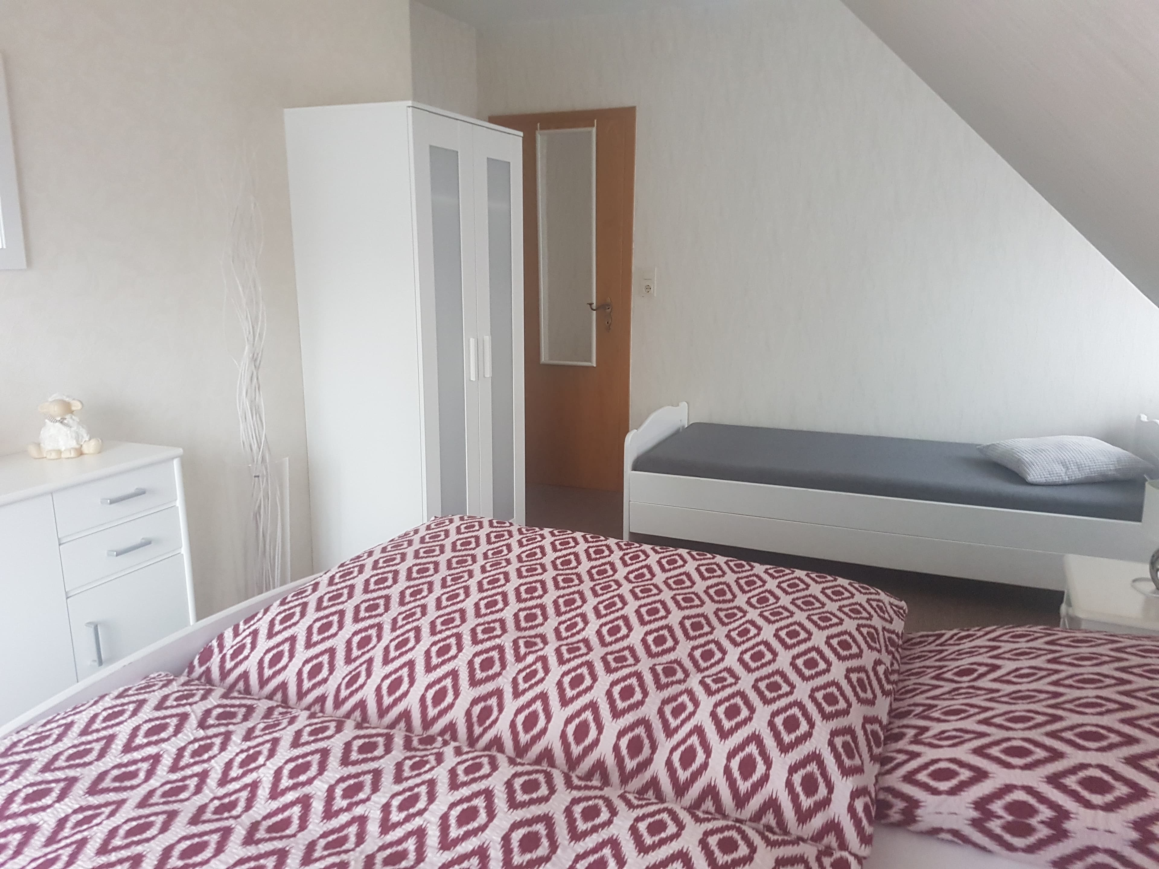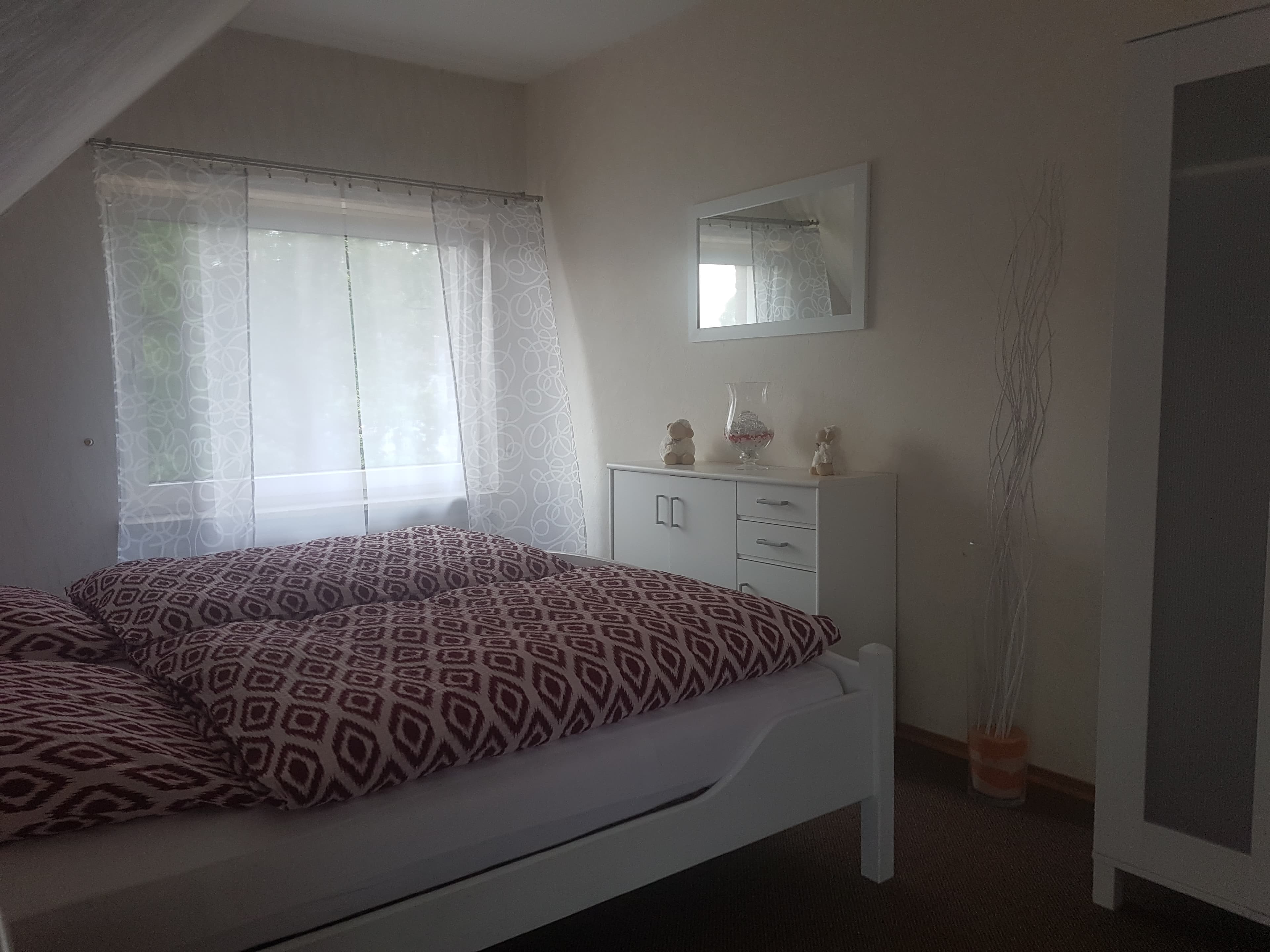 Ferienwohnung im Obergeschoss, ca. 60qm groß; 1 Wohn-Schlafzimmer, 1 Schlafzimmer mit Doppel-und Einzelbett, Küche und Vollbad mit Duschvorrichtung. Gartenhaus mit Grillmöglichkeit, Autostellplatz, Fahrradverleih möglich, Sat TV.