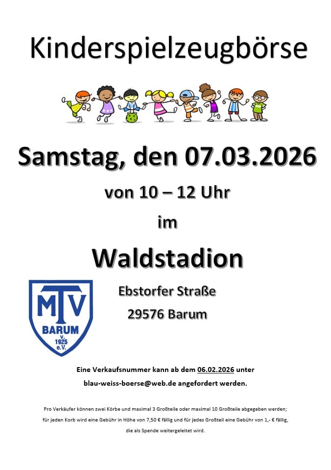 BarumAm Samstag, 7. März veranstaltet das Börsenteam des MTV Barum eine Kinderspielzeugbörse im Vereinsheim. Hier wartet gut erhaltenes Spielzeug in der Zeit von 10-12 Uhr auf neue Besitzer.