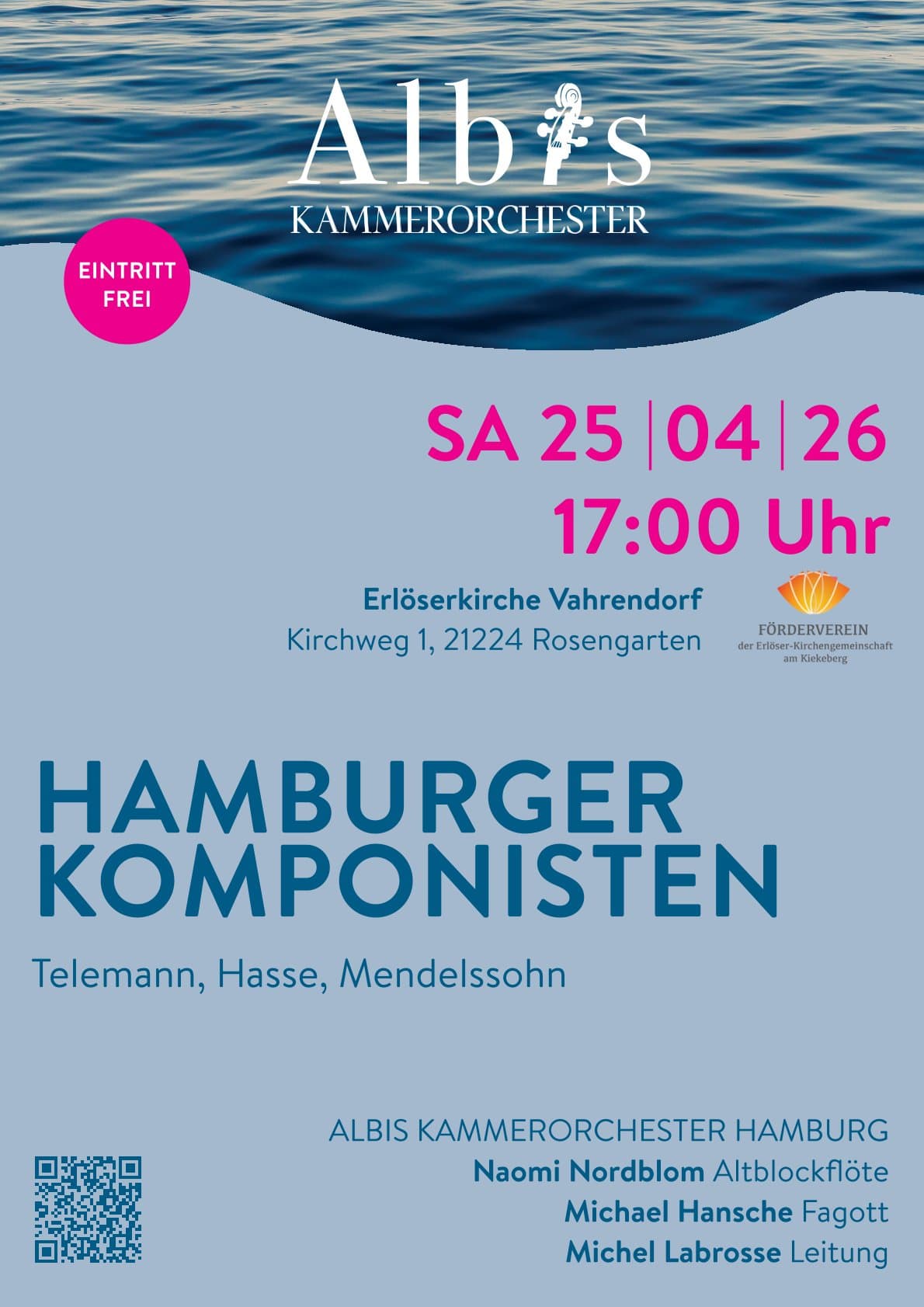 Rosengarten-In seinem Frühjahrskonzert präsentiert das ALBIS KAMMERORCHESTER Stücke von Komponisten, die in Hamburg und Umgebung geboren wurden oder lange dort gewirkt haben und das Musikleben der Stadt prägten: Georg Philipp Telemann (1681-1767), Johann Adolph Hasse (1699-1783) und Felix Mendelssohn Bartholdy…