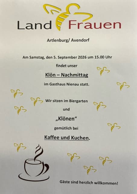 Artlenburg-Wir sitzen im Biergarten des Gasthauses Nienau und klönen bei Kaffee, Torte und anderen Getränken. Bei Regen sitzen wir im Wintergarten.