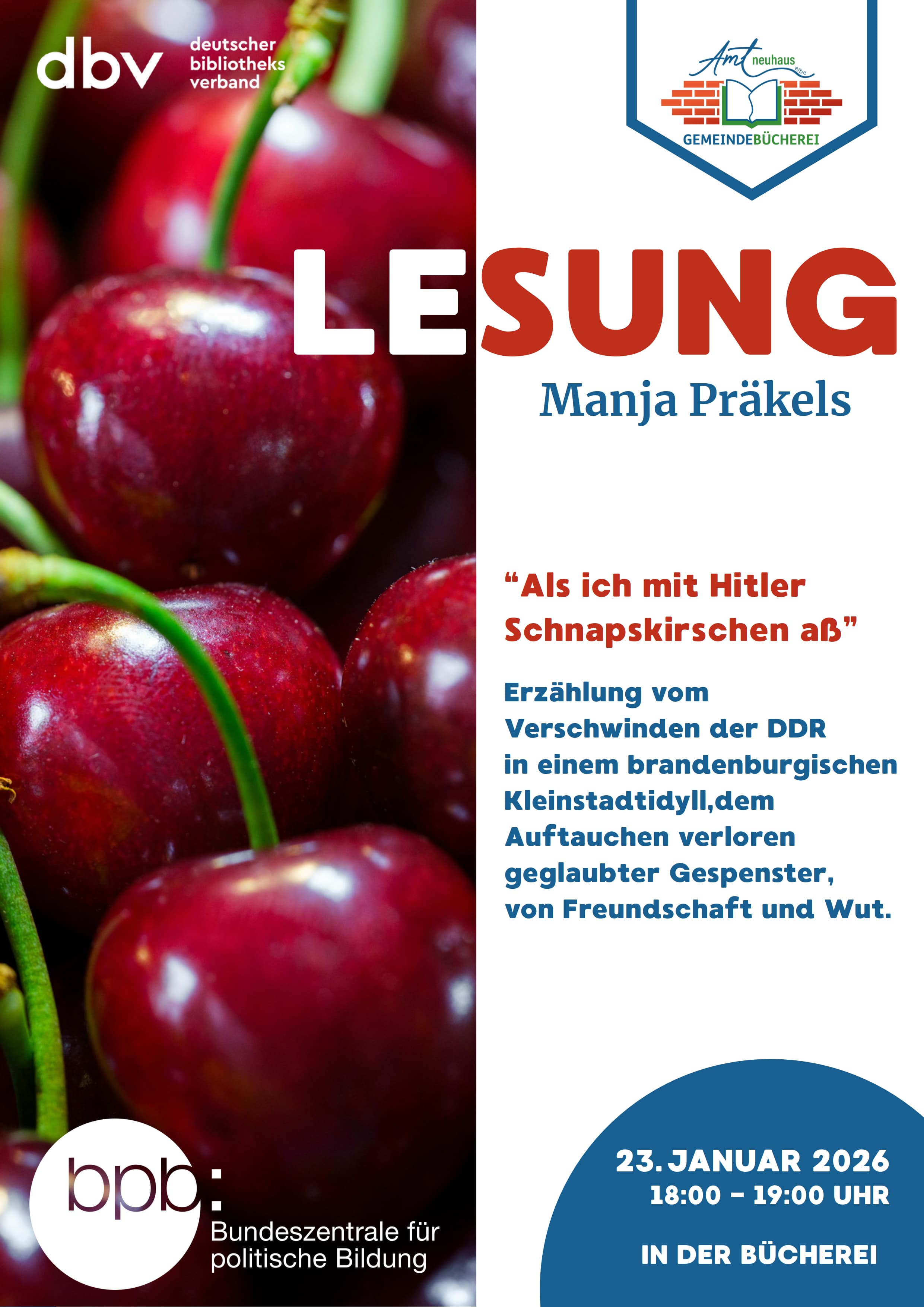 Amt Neuhaus-LESUNG mit Manja Präkels “Als ich mit Hitler Schnapskirschen aß” IN DER BÜCHEREI 23.JANUAR 2026: 18:00 - 19:00 Uhr Erzählung vom Verschwinden der DDR in einem brandenburgischen Kleinstadtidyll,dem Auftauchen verloren geglaubter Gespenster, von Freundschaft und Wut. Gefördert durch die Bundesze…