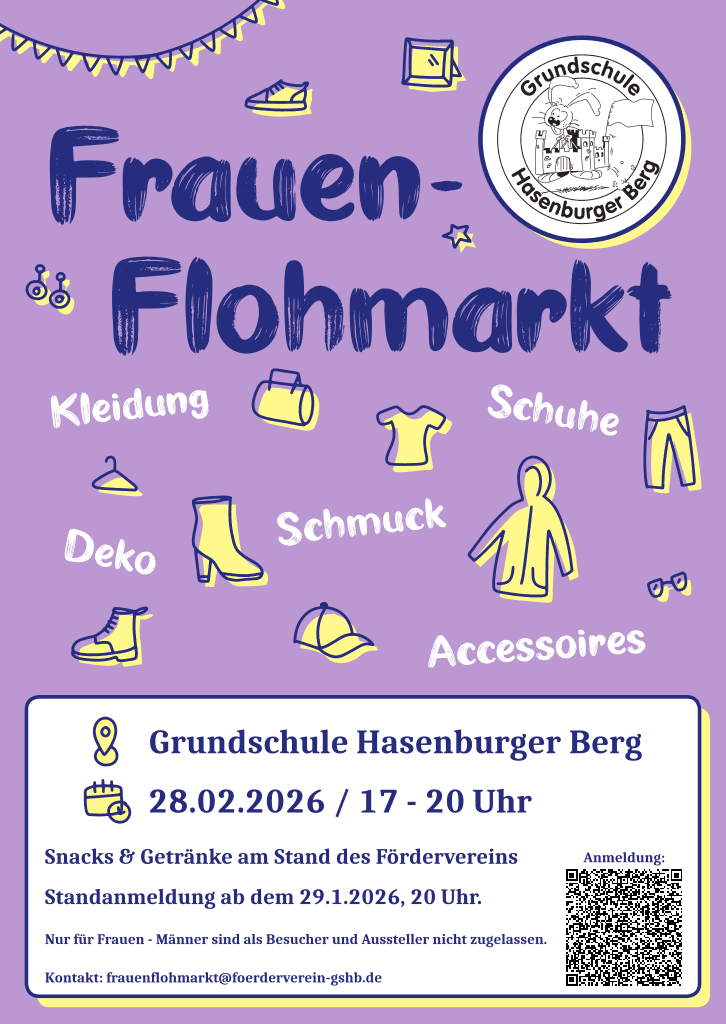 Lüneburg-Mädels, geht shoppen! 👗👜✨ Am 28.02.2025 findet von 17:00 – 20:00 Uhr unser Frauenflohmarkt in der Grundschule Hasenburger Berg (Hasenburger Berg 47, 21335 Lüneburg) statt.