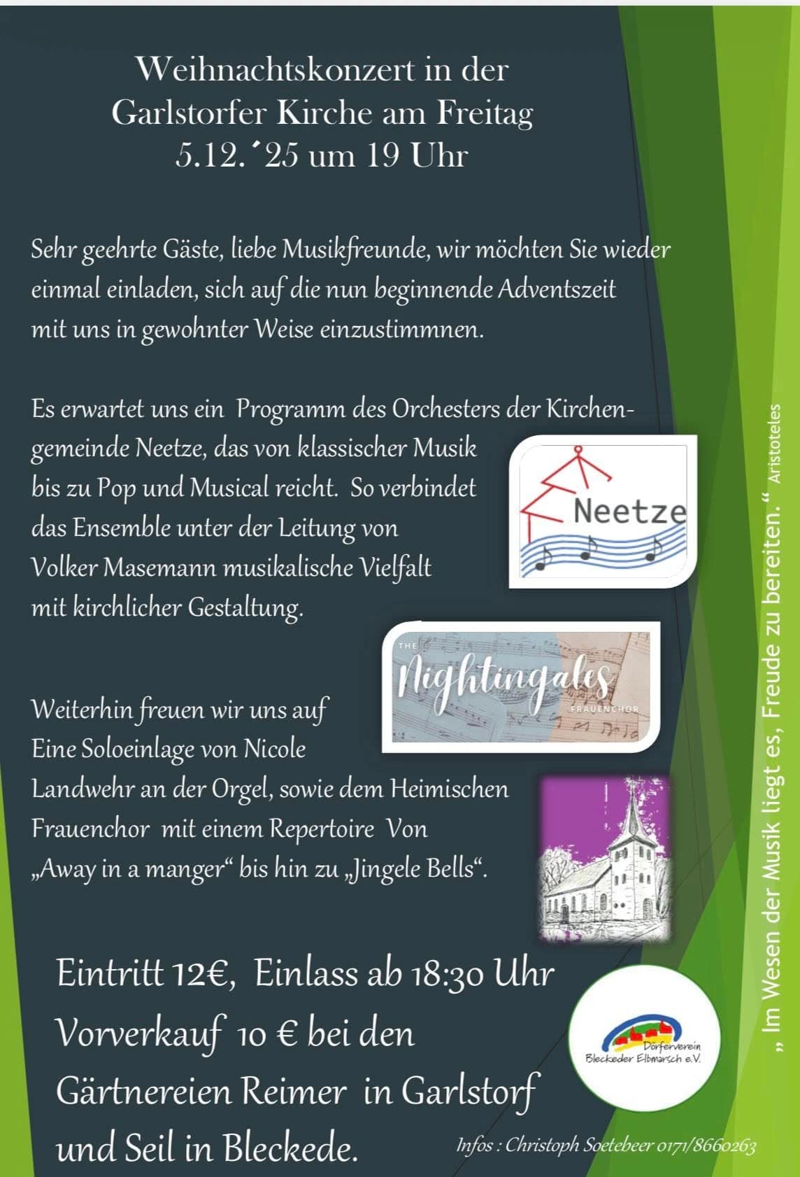 BleckedeAb demMit dem Orchester der Kirchengemeinde Neetze unter der Leitung von Volker Masemann, Nicole Landwehr an der Orgel sowie dem Chor Nightingales Eintritt: 12,- € Einlass ab 18.30 Uhr Vorverkauf 10,- € bei der Gärtnerei Reimer in Garlstorf und Blumen Seil in Bleckede