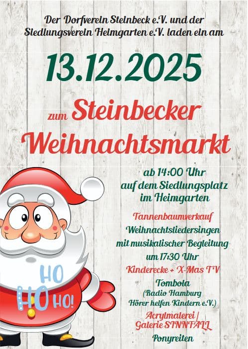 -Auch in Steinbeck ist wieder Weihnachtsmarkt. Der Dorfverein Steinbeck und der Siedlungsverein Heimgarten laden wieder zum gemütlichen dörflichen Steinbecker Weihnachtsmarkt ein. Dieser findet am Samstag, 13. Dezember 2025, ab 14 Uhr auf dem Siedlungsplatz im Heimgarten statt.