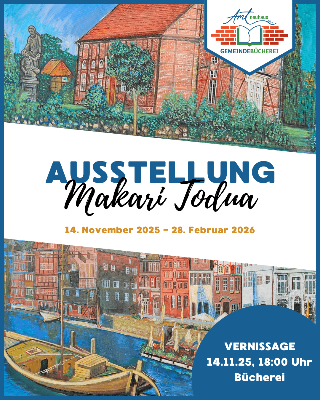 Amt NeuhausMakari Todua stellt seine Kunstwerke von und um Amt Neuhaus in der Bücherei Amt Neuhaus (Am Markt 5, 19273 Neuhaus) aus. Noch bis zum 26.02.2026. Öffnungszeiten: Dienstag: 15:00 - 18:00 Uhr Mittwoch: 13:00 - 16:00 Uhr Donnerstag: 10:00 - 16:00 Uhr