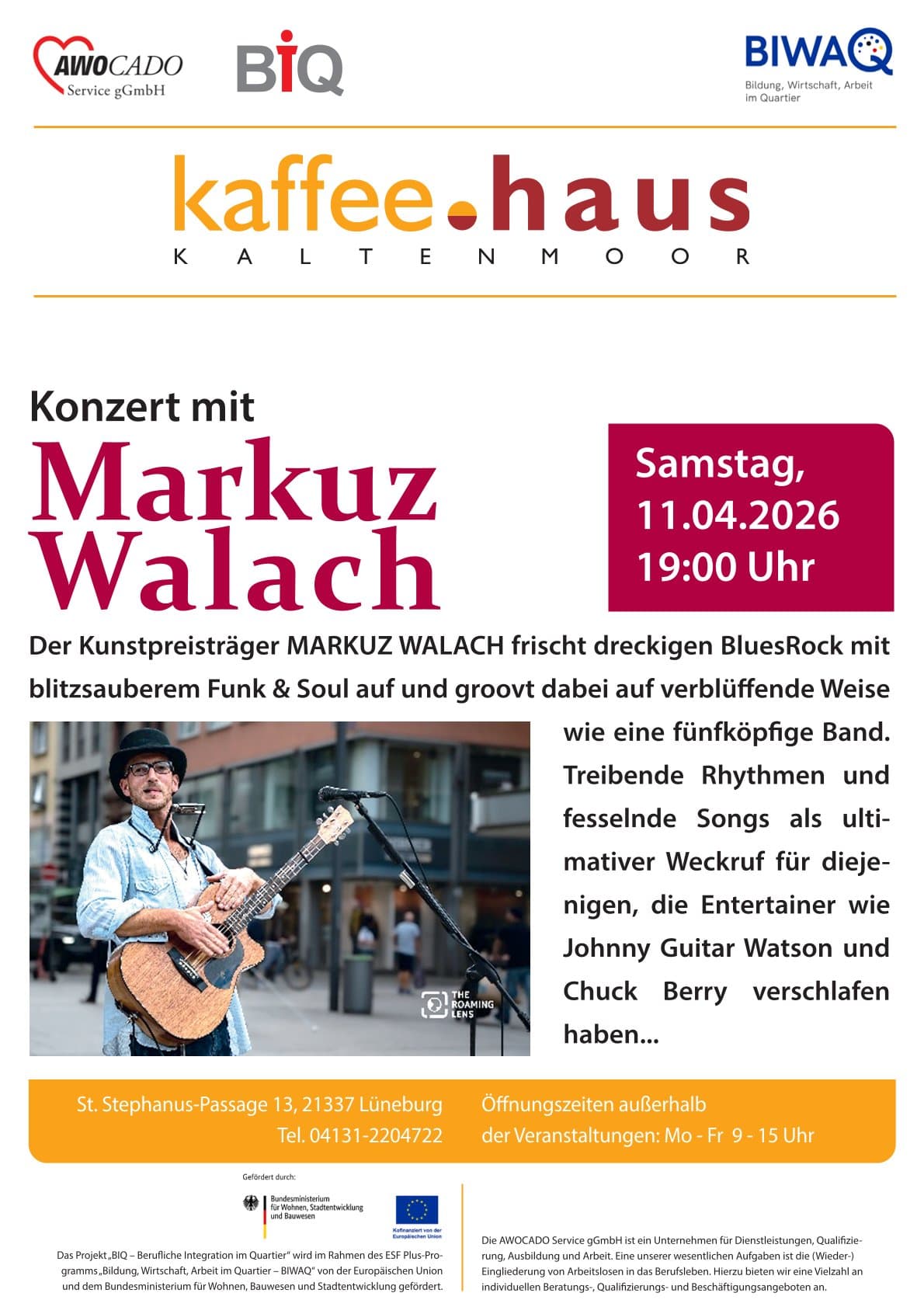 LüneburgDer Kunstpreisträger MARKUZ WALACH frischt dreckigen BluesRock mit blitzsauberem Funk & Soul auf und groovt dabei auf verblüffende Weise wie eine fünfköpfige Band.